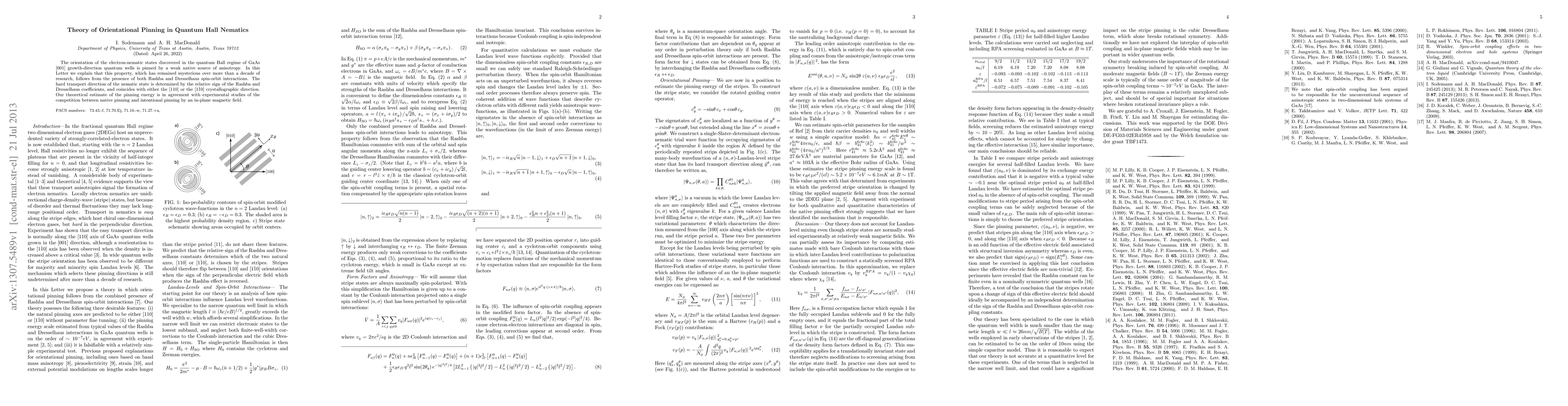 The paper theorizes that native orientational pinning in quantum Hall nematics arises from Rashba and Dresselhaus spin-orbit interactions, determining the hard transport direction along [110] or [1\bar{1}0] crystal axes. The theoretical pinning energy aligns with experimental findings.
