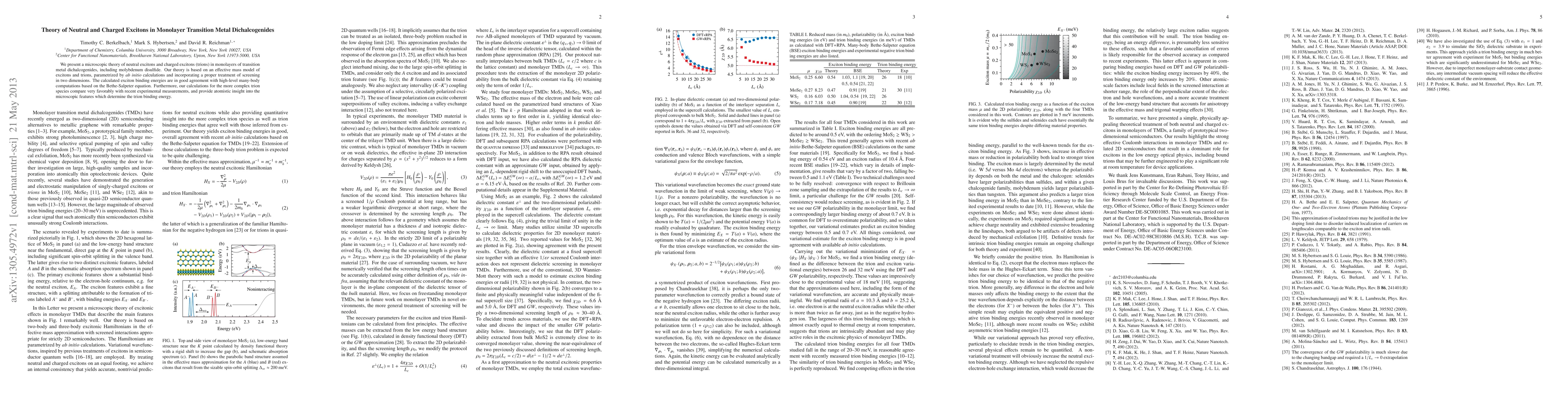 We present a microscopic theory of neutral excitons and charged excitons (trions) in monolayers of transition metal dichalcogenides, including molybdenum disulfide. Our theory is based on an effective mass model of excitons and trions, parametrized by ab initio calculations and incorporating a proper treatment of screening in two dimensions. The calculated exciton binding energies are in good agreement with high-level many-body computations based on the Bethe-Salpeter equation. Furthermore, our calculations for the more complex trion species compare very favorably with recent experimental measurements, and provide atomistic insight into the microscopic features which determine the trion binding energy.