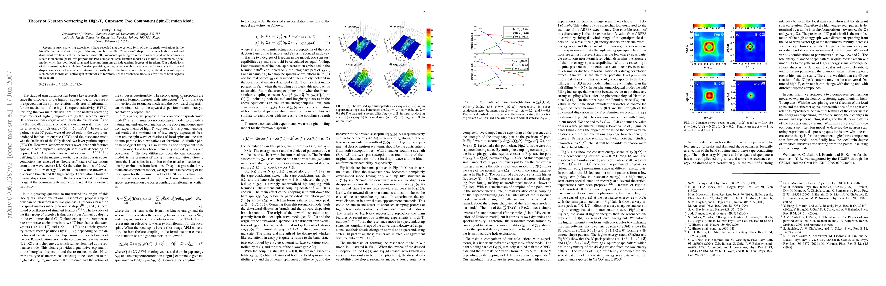 This paper proposes a two-component spin-fermion model to explain the "hourglass" shape of magnetic excitations in high-T$_c$ cuprates observed in neutron scattering experiments. The model successfully captures the interplay between local spins and itinerant fermions, showing that the upward and downward branches of magnetic excitations arise from local and collective spin excitations, respectively.