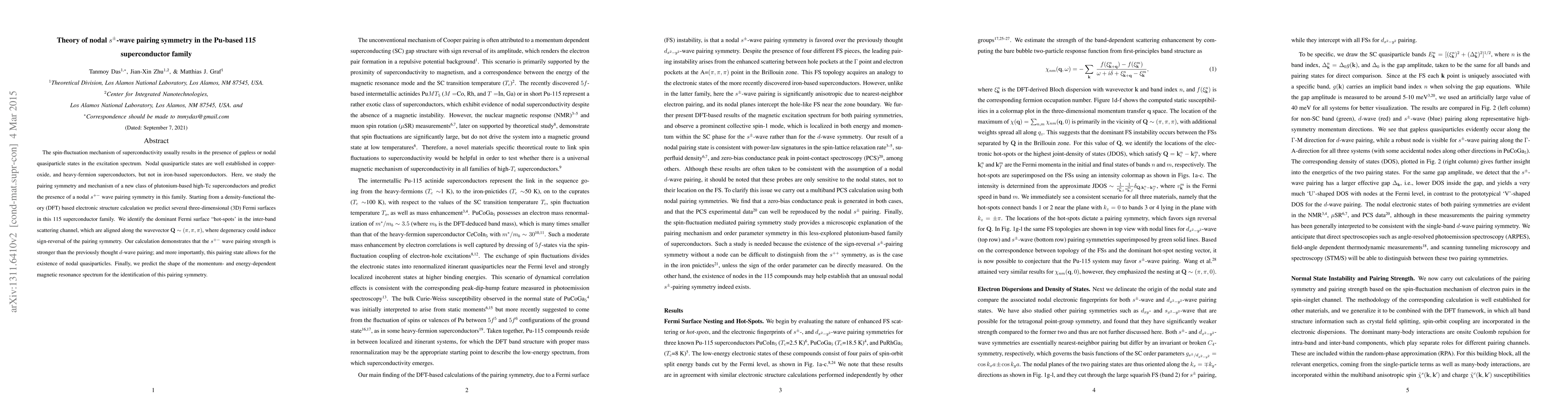 The spin-fluctuation mechanism of superconductivity usually results in the presence of gapless or nodal quasiparticle states in the excitation spectrum. Nodal quasiparticle states are well established in copper-oxide, and heavy-fermion superconductors, but not in iron-based superconductors. Here, we study the pairing symmetry and mechanism of a new class of plutonium-based high-Tc superconductors and predict the presence of a nodal $s^{+-}$ wave pairing symmetry in this family. Starting from a density-functional theory (DFT) based electronic structure calculation we predict several three-dimensional (3D) Fermi surfaces in this 115 superconductor family. We identify the dominant Fermi surface ``hot-spots' in the inter-band scattering channel, which are aligned along the wavevector ${\bf Q}\sim(\pi,\pi,\pi)$, where degeneracy could induce sign-reversal of the pairing symmetry. Our calculation demonstrates that the $s^{+-}$ wave pairing strength is stronger than the previously thought $d$-wave pairing; and more importantly, this pairing state allows for the existence of nodal quasiparticles. Finally, we predict the shape of the momentum- and energy-dependent magnetic resonance spectrum for the identification of this pairing symmetry.