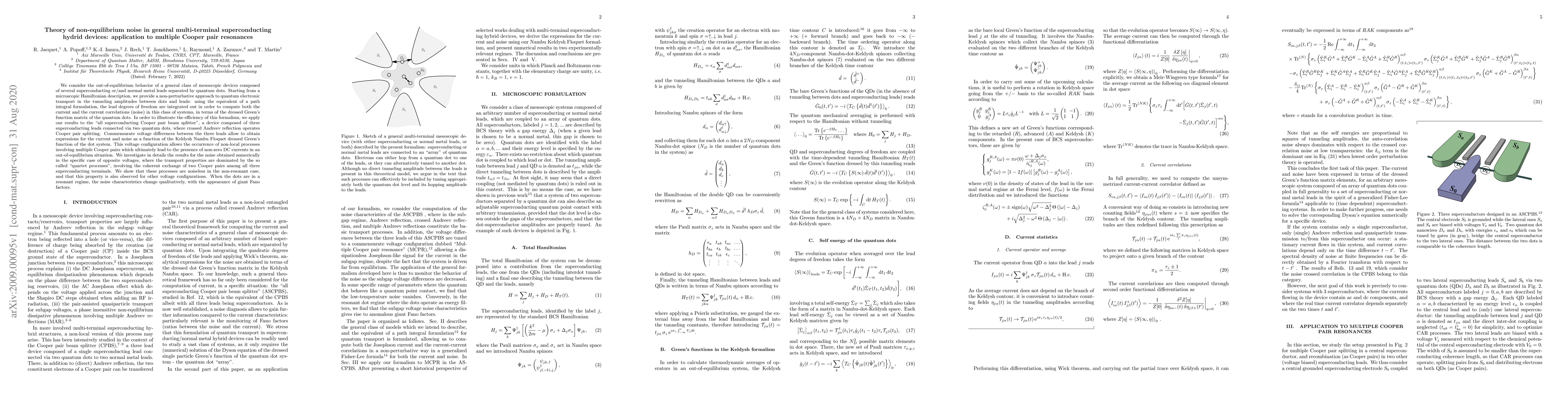 We consider the out-of-equilibrium behavior of a general class of mesoscopic devices composed of several superconducting or/and normal metal leads separated by quantum dots. Starting from a microscopic Hamiltonian description, we provide a non-perturbative approach to quantum electronic transport in the tunneling amplitudes between dots and leads: using the equivalent of a path integral formulation, the lead degrees of freedom are integrated out in order to compute both the current and the current correlations (noise) in this class of systems, in terms of the dressed Green's function matrix of the quantum dots. In order to illustrate the efficiency of this formalism, we apply our results to the "all superconducting Cooper pair beam splitter", a device composed of three superconducting leads connected via two quantum dots, where crossed Andreev reflection operates Cooper pair splitting. Commensurate voltage differences between the three leads allow to obtain expressions for the current and noise as a function of the Keldysh Nambu Floquet dressed Green's function of the dot system. This voltage configuration allows the occurrence of non-local processes involving multiple Cooper pairs which ultimately lead to the presence of non-zero DC currents in an out-of-equilibrium situation. We investigate in details the results for the noise obtained numerically in the specific case of opposite voltages, where the transport properties are dominated by the so called "quartet processes", involving the coherent exchange of two Cooper pairs among all three superconducting terminals. We show that these processes are noiseless in the non-resonant case, and that this property is also observed for other voltage configurations. When the dots are in a resonant regime, the noise characteristics change qualitatively, with the appearance of giant Fano factors.