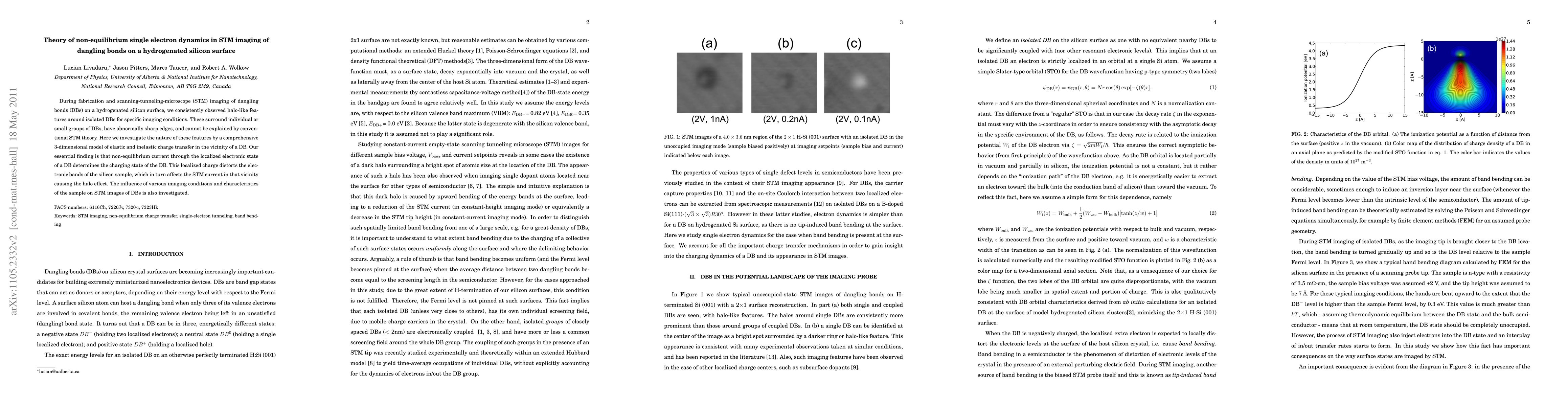 This paper investigates the halo-like features observed around dangling bonds on a hydrogenated silicon surface during STM imaging, proposing that non-equilibrium single electron dynamics cause localized charge distortions that affect the electronic bands and lead to the observed halo effect. The study also explores how different imaging conditions influence these STM images.