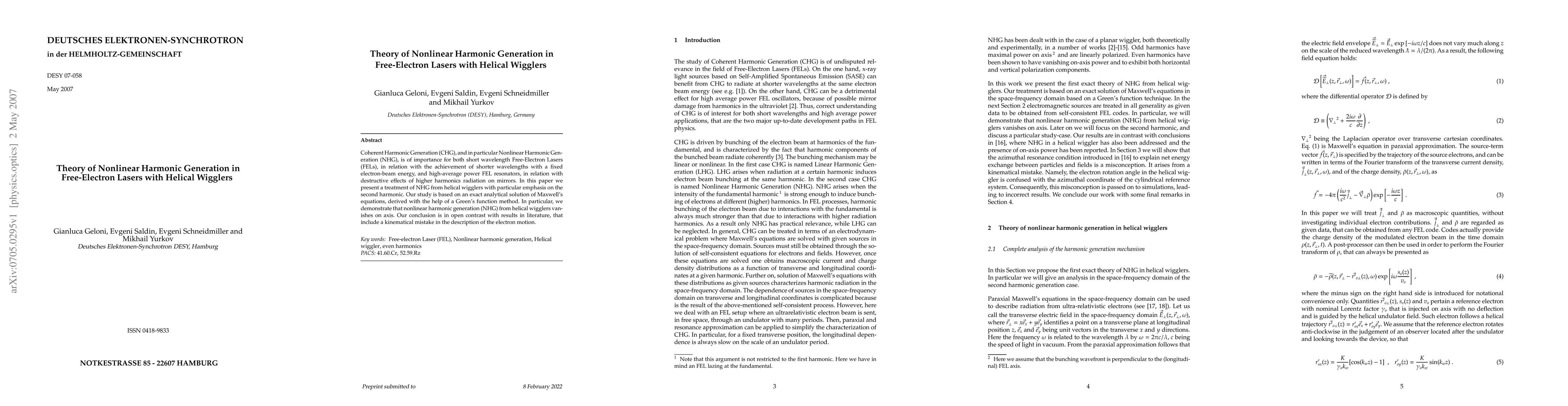 This paper presents an analytical solution for Nonlinear Harmonic Generation (NHG) in free-electron lasers with helical wigglers, emphasizing the second harmonic. It reveals that NHG vanishes on axis, contradicting previous literature due to a kinematical error in those studies.