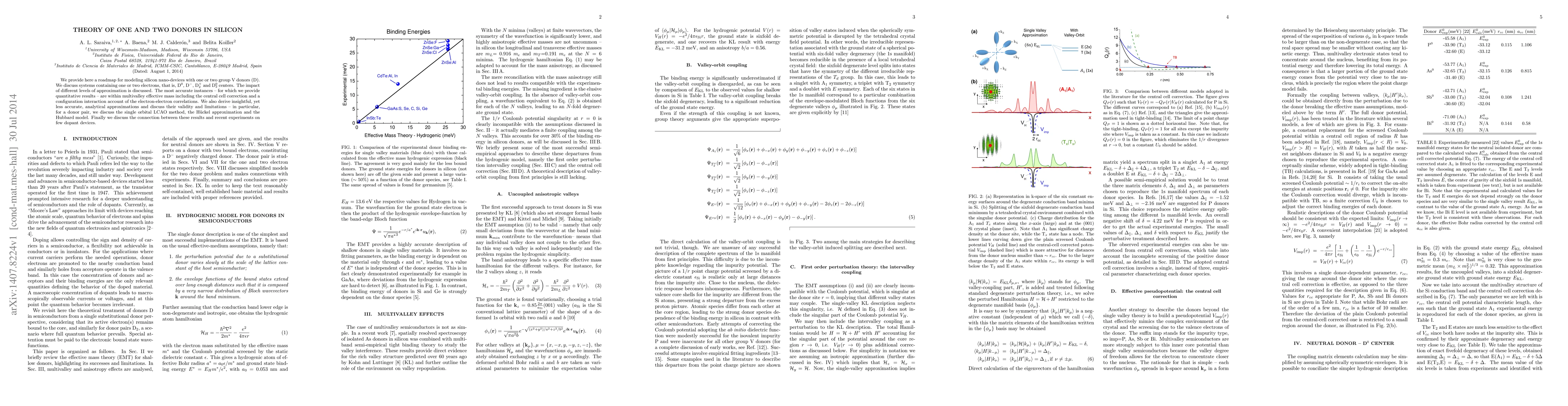 This paper outlines a comprehensive theoretical framework for modeling silicon nano-devices with one or two group V donors, detailing the behavior of D^0, D^-, D_2^+, and D_2^0 centers. It compares various levels of approximation, highlighting the most accurate multivalley effective mass models and discussing simpler analytical approximations like the LCAO method and the Hubbard model.