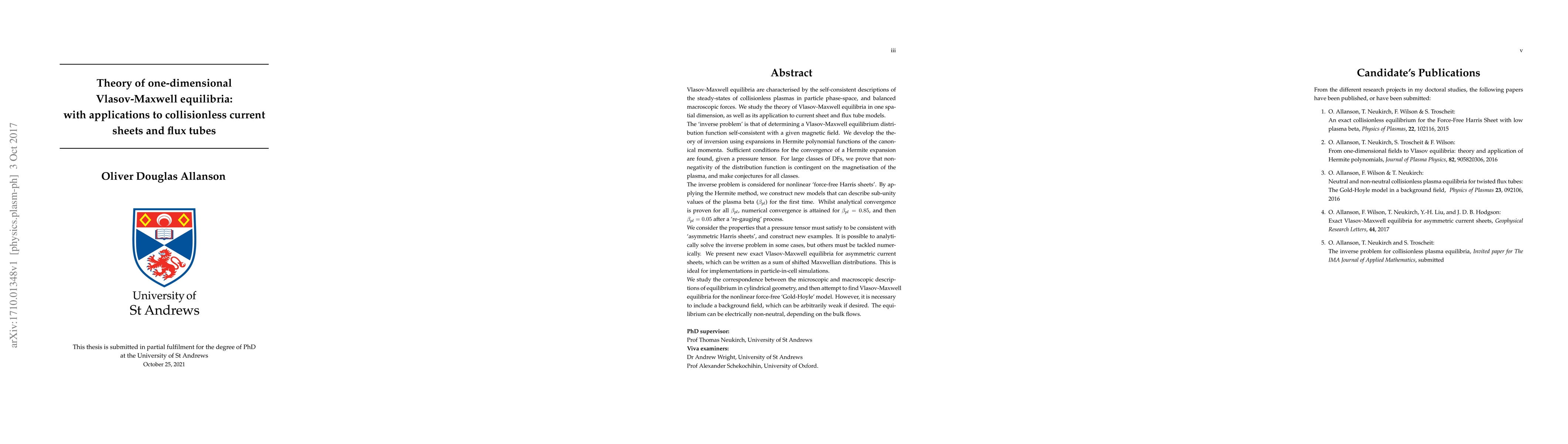 We study the theory of Vlasov-Maxwell equilibria in one spatial dimension, as well as its application to current sheet and flux tube models. The 'inverse problem' is that of determining a Vlasov-Maxwell equilibrium distribution function self-consistent with a given magnetic field. We develop the theory of inversion using expansions in Hermite polynomials of the canonical momenta. Sufficient conditions for the convergence of a Hermite expansion are found, given a pressure tensor. For large classes of DFs, we prove that non-negativity of the distribution function is contingent on the magnetisation of the plasma, and make conjectures for all classes. The inverse problem is considered for nonlinear 'force-free Harris sheets'. By applying the Hermite method, we construct new models that can describe sub-unity values of the plasma beta $(\beta_{pl})$ for the first time. Whilst analytical convergence is proven for all $\beta_{pl}$, numerical convergence is attained for $\beta_{pl}= 0.85$, and then $\beta_{pl} = 0.05$ after a 're-gauging' process. We consider the properties that a pressure tensor must satisfy to be consistent with 'asymmetric Harris sheets', and construct new examples. It is possible to analytically solve the inverse problem in some cases, others must be tackled numerically. We present new exact Vlasov-Maxwell equilibria for asymmetric current sheets, which can be written as a sum of shifted Maxwellian distributions, ideal for implementations in particle-in-cell simulations. We study the correspondence between the microscopic and macroscopic descriptions of equilibrium in cylindrical geometry, and then attempt to find Vlasov-Maxwell equilibria for the nonlinear force-free 'Gold-Hoyle' model. However, it is necessary to include a background field, which can be arbitrarily weak if desired. The equilibrium can be electrically non-neutral, depending on the bulk flows.