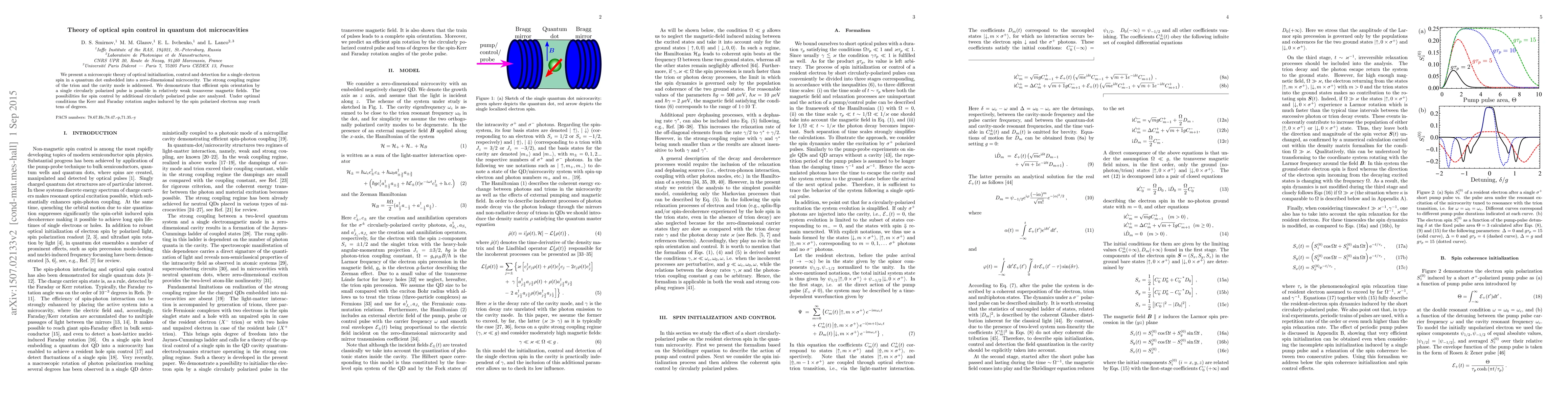 We present a microscopic theory of optical initialization, control and detection for a single electron spin in a quantum dot embedded into a zero-dimensional microcavity. The strong coupling regime of the trion and the cavity mode is addressed. We demonstrate that efficient spin orientation by a single circularly polarized pulse is possible in relatively weak transverse magnetic fields. The possibilities for spin control by additional circularly polarized pulse are analyzed. Under optimal conditions the Kerr and Faraday rotation angles induced by the spin polarized electron may reach tens of degrees.