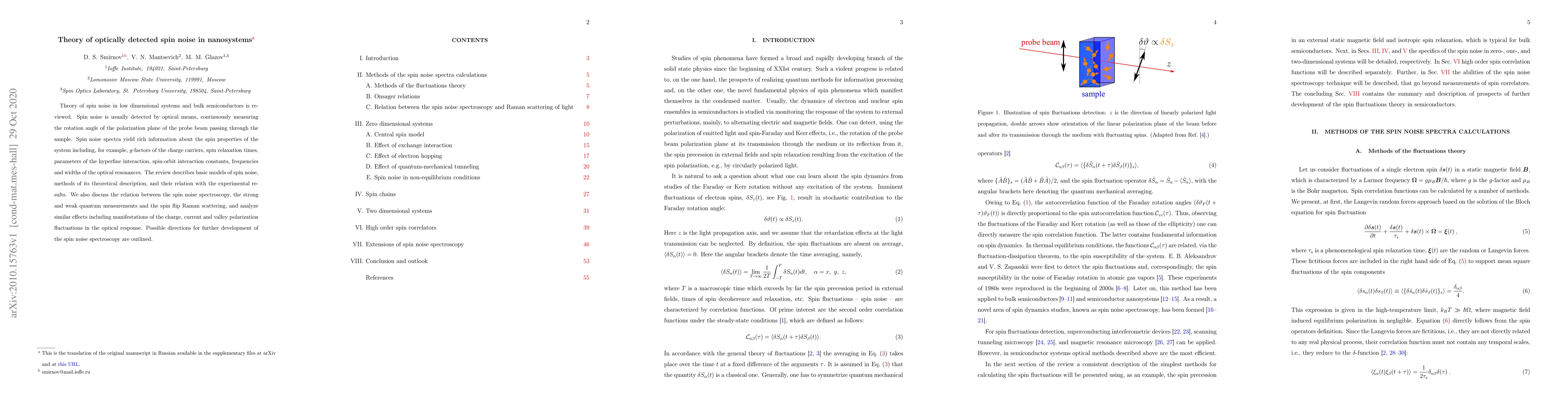 Theory of spin noise in low dimensional systems and bulk semiconductors is reviewed. Spin noise is usually detected by optical means, continuously measuring the rotation angle of the polarization plane of the probe beam passing through the sample. Spin noise spectra yield rich information about the spin properties of the system including, for example, $g$-factors of the charge carriers, spin relaxation times, parameters of the hyperfine interaction, spin-orbit interaction constants, frequencies and widths of the optical resonances. The review describes basic models of spin noise, methods of its theoretical description, and their relation with the experimental results. We also discuss the relation between the spin noise spectroscopy, the strong and weak quantum measurements and the spin flip Raman scattering, and analyze similar effects including manifestations of the charge, current and valley polarization fluctuations in the optical response. Possible directions for further development of the spin noise spectroscopy are outlined.