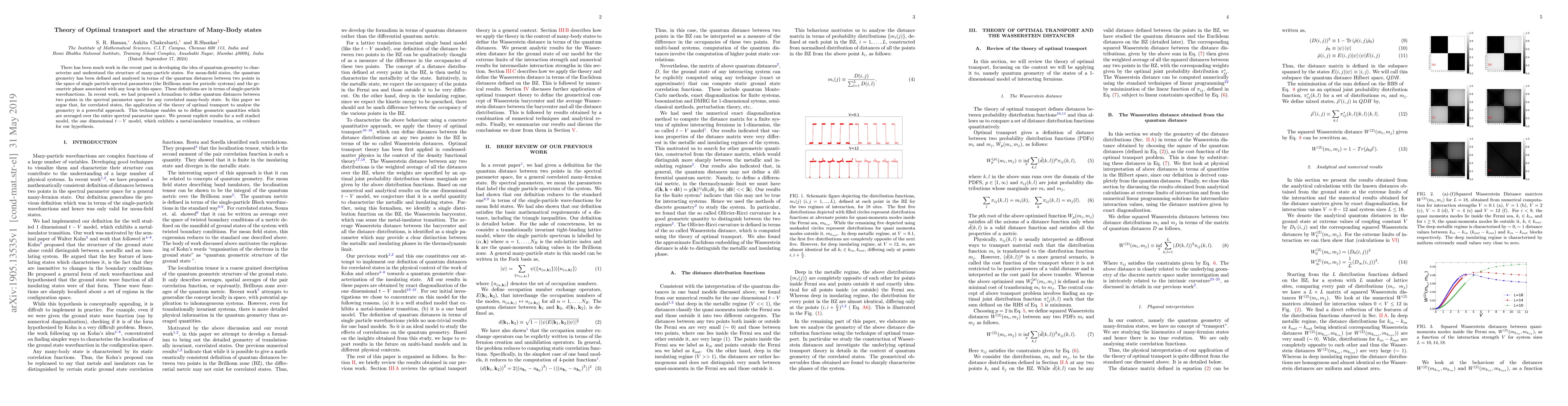 There has been much work in the recent past in developing the idea of quantum geometry to characterize and understand the structure of many-particle states. For mean-field states, the quantum geometry has been defined and analysed in terms of the quantum distances between two points in the space of single particle spectral parameters (the Brillioun zone for periodic systems) and the geometric phase associated with any loop in this space. These definitions are in terms of single-particle wavefunctions. In recent work, we had proposed a formalism to define quantum distances between two points in the spectral parameter space for any correlated many-body state. In this paper we argue that, for correlated states, the application of the theory of optimal transport to analyse the geometry is a powerful approach. This technique enables us to define geometric quantities which are averaged over the entire spectral parameter space. We present explicit results for a well studied model, the one dimensional t-V model, which exhibits a metal-insulator transition, as evidence for our hypothesis.