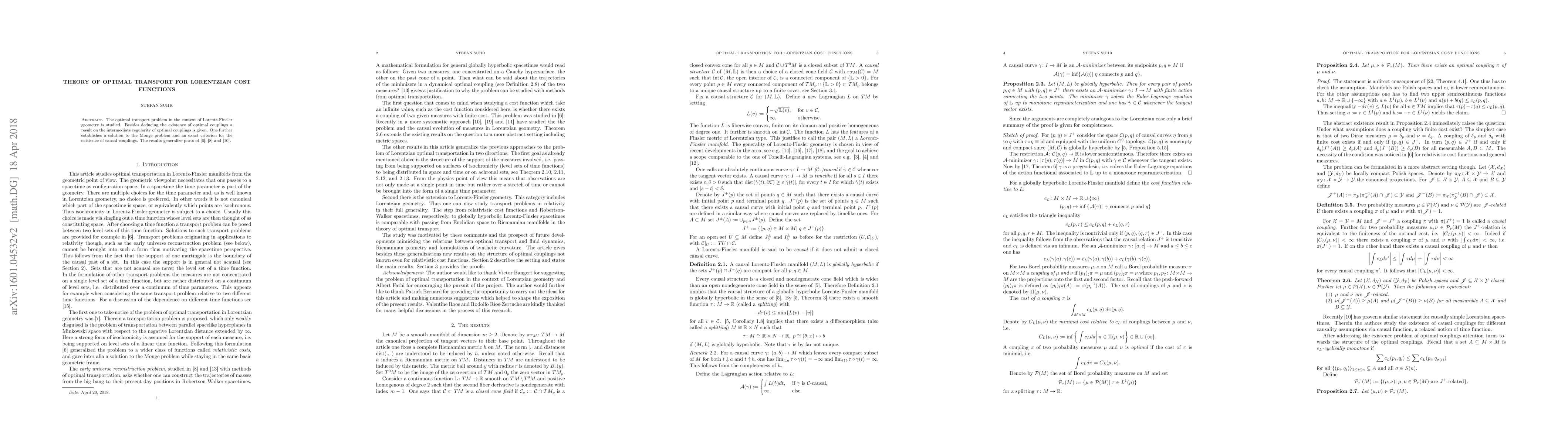 The optimal transport problem is studied in the context of Lorentz-Finsler geometry. For globally hyperbolic Lorentz-Finsler spacetimes the first Kantorovich problem and the Monge problem are solved. Further the intermediate regularity of the transport paths is studied. These results generalize parts of Bertrand & Puel and Brenier et al.