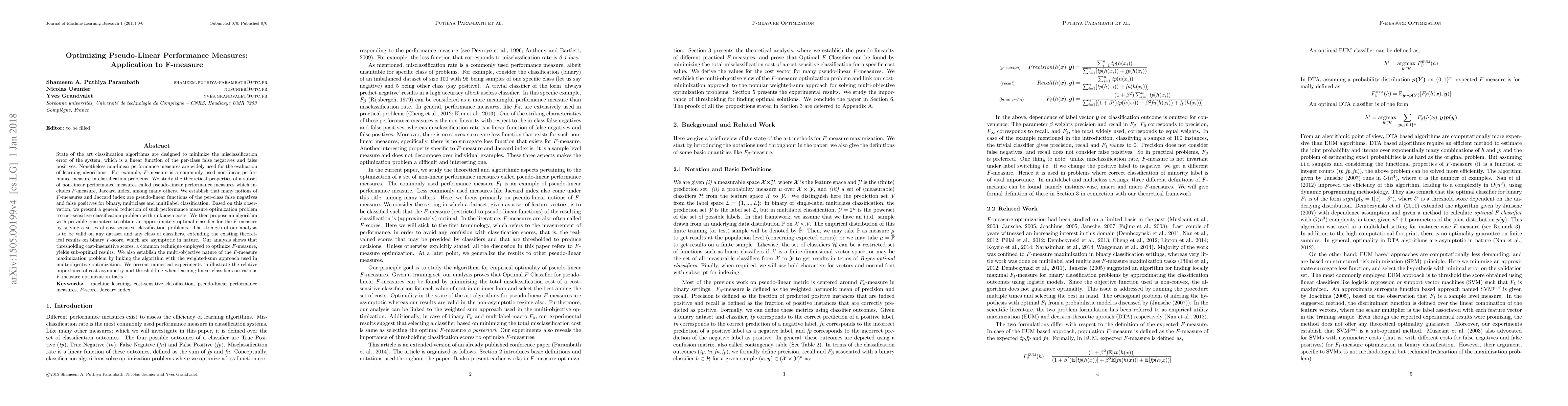 This paper explores the theoretical properties of pseudo-linear performance measures, including the $F$-measure, and demonstrates their relationship with false negatives and false positives. It proposes an algorithm to optimize these measures by reducing the problem to cost-sensitive classification, providing provable guarantees for approximately optimal classifiers.