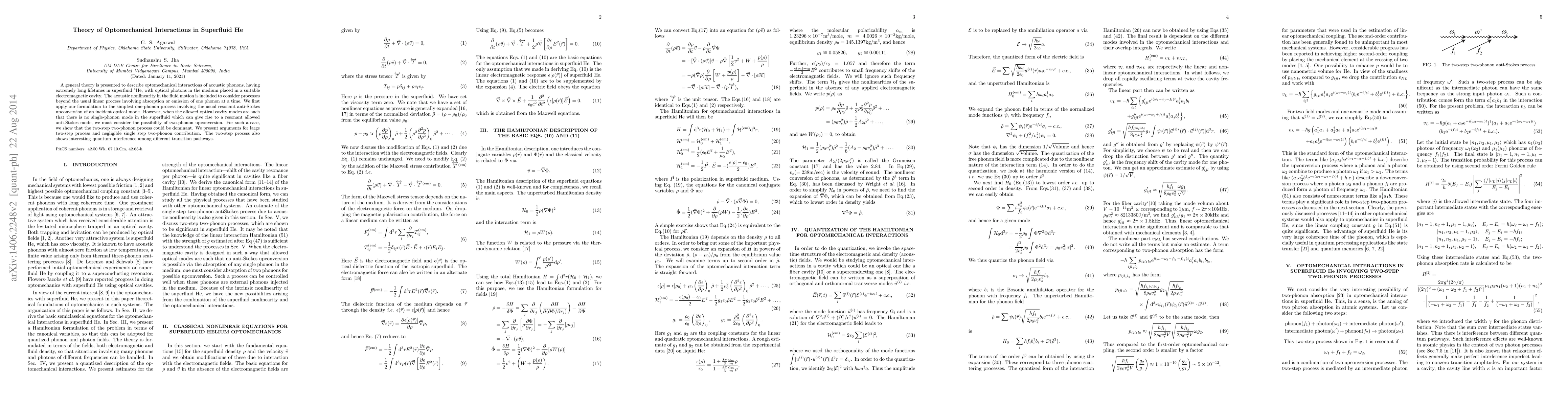 A general theory is presented to describe optomechanical interactions of acoustic phonons, having extremely long lifetimes in superfluid $^4$He, with optical photons in the medium placed in a suitable electromagnetic cavity. The acoustic nonlinearity in the fluid motion is included to consider processes beyond the usual linear process involving absorption or emission of one phonon at a time. We first apply our formulation to the simplest one-phonon process involving the usual resonant anti-Stokes upconversion of an incident optical mode. However, when the allowed optical cavity modes are such that there is no single-phonon mode in the superfluid which can give rise to a resonant allowed anti-Stokes mode, we must consider the possibility of two phonon upconversion. For such a case, we show that the two step two phonon process could be dominant. We present arguments for large two step process and negligible single step two phonon contribution. The two step process also shows interesting quantum interference among different transition pathways.