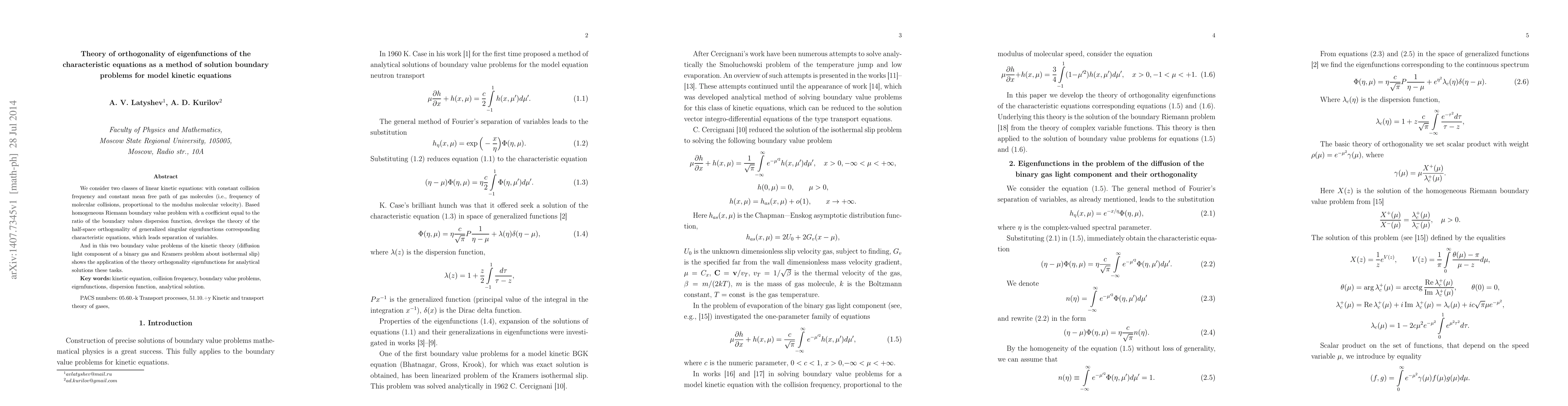 We consider two classes of linear kinetic equations: with constant collision frequency and constant mean free path of gas molecules (i.e., frequency of molecular collisions, proportional to the modulus molecular velocity). Based homogeneous Riemann boundary value problem with a coefficient equal to the ratio of the boundary values dispersion function, develops the theory of the half-space orthogonality of generalized singular eigenfunctions corresponding characteristic equations, which leads separation of variables. And in this two boundary value problems of the kinetic theory (diffusion light component of a binary gas and Kramers problem about isothermal slip) shows the application of the theory orthogonality eigenfunctions for analytical solutions these tasks.