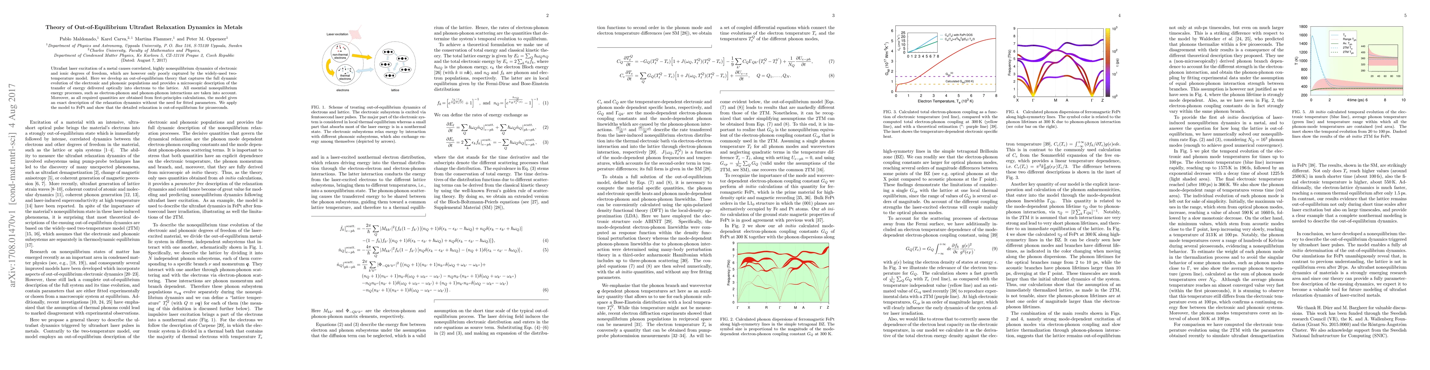 Ultrafast laser excitation of a metal causes correlated, highly nonequilibrium dynamics of electronic and ionic degrees of freedom, which are however only poorly captured by the widely-used two-temperature model. Here we develop an out-of-equilibrium theory that captures the full dynamic evolution of the electronic and phononic populations and provides a microscopic description of the transfer of energy delivered optically into electrons to the lattice. All essential nonequilibrium energy processes, such as electron-phonon and phonon-phonon interactions are taken into account. Moreover, as all required quantities are obtained from first-principles calculations, the model gives an exact description of the relaxation dynamics without the need for fitted parameters. We apply the model to FePt and show that the detailed relaxation is out-of-equilibrium for picoseconds.