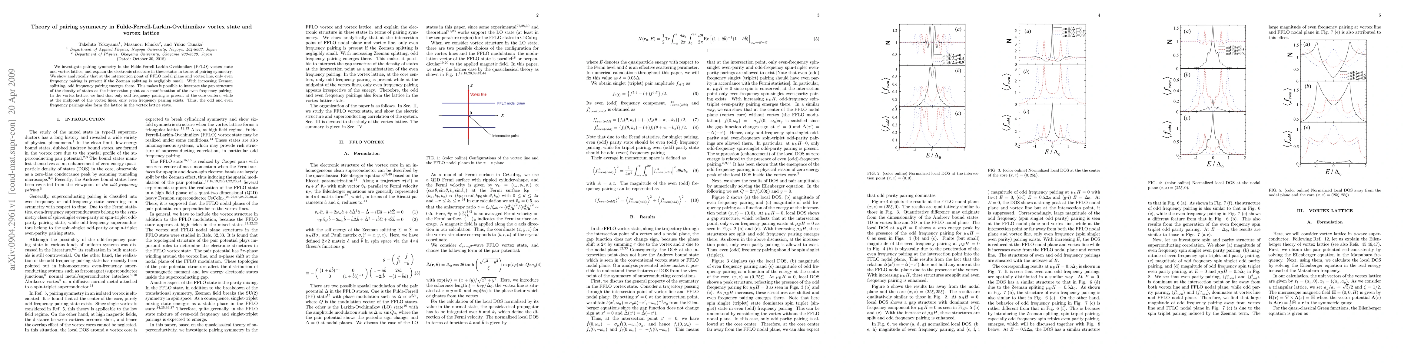 We investigate pairing symmetry in the Fulde-Ferrell-Larkin-Ovchinnikov (FFLO) vortex state and vortex lattice, and explain the electronic structure in these states in terms of pairing symmetry. We show analytically that at the intersection point of FFLO nodal plane and vortex line, only even frequency pairing is present if the Zeeman splitting is negligibly small. With increasing Zeeman splitting, odd frequency pairing emerges there. This makes it possible to interpret the gap structure of the density of states at the intersection point as a manifestation of the even frequency pairing. In the vortex lattice, we find that only odd frequency pairing is present at the core centers, while at the midpoint of the vortex lines, only even frequency pairing exists. Thus, the odd and even frequency pairings also form the lattice in the vortex lattice state.