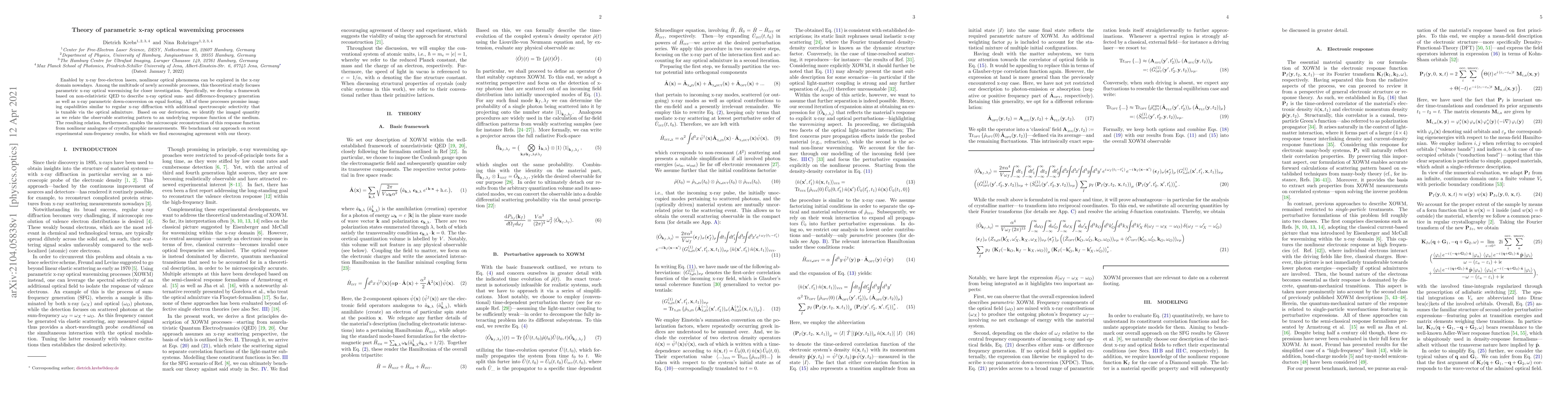 Enabled by x-ray free-electron lasers, nonlinear optical phenomena can be explored in the x-ray domain nowadays. Among the multitude of newly accessible processes, this theoretical study focuses parametric x-ray optical wavemixing for closer investigation. Specifically, we develop a framework based on non-relativistic QED to describe x-ray optical sum- and difference-frequency generation as well as x-ray parametric down-conversion on equal footing. All of these processes promise imaging capabilities similar to regular x-ray diffraction with additional spectroscopic selectivity that is tunable via the optical admixture. Based on our derivation, we identify the imaged quantity as we relate the observable scattering pattern to an underlying response function of the medium. The resulting relation, furthermore, enables the microscopic reconstruction of this response function from nonlinear analogues of crystallographic measurements. We benchmark our approach on recent experimental sum-frequency results, for which we find encouraging agreement with our theory.