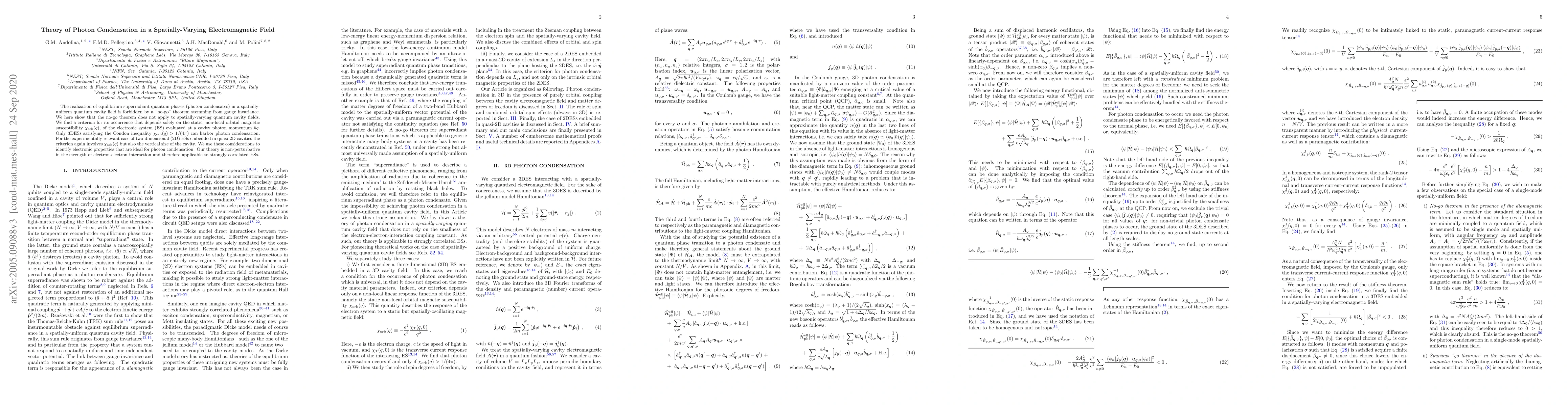 The realization of equilibrium superradiant quantum phases (photon condensates) in a spatially-uniform quantum cavity field is forbidden by a "no-go" theorem stemming from gauge invariance. We here show that the no-go theorem does not apply to spatially-varying quantum cavity fields. We find a criterion for its occurrence that depends solely on the static, non-local orbital magnetic susceptibility $\chi_{\rm orb}(q)$, of the electronic system (ES) evaluated at a cavity photon momentum $\hbar q$. Only 3DESs satisfying the Condon inequality $\chi_{\rm orb}(q)>1/(4\pi)$ can harbor photon condensation. For the experimentally relevant case of two-dimensional (2D) ESs embedded in quasi-2D cavities the criterion again involves $\chi_{\rm orb}(q)$ but also the vertical size of the cavity. We use these considerations to identify electronic properties that are ideal for photon condensation. Our theory is non-perturbative in the strength of electron-electron interaction and therefore applicable to strongly correlated ESs.