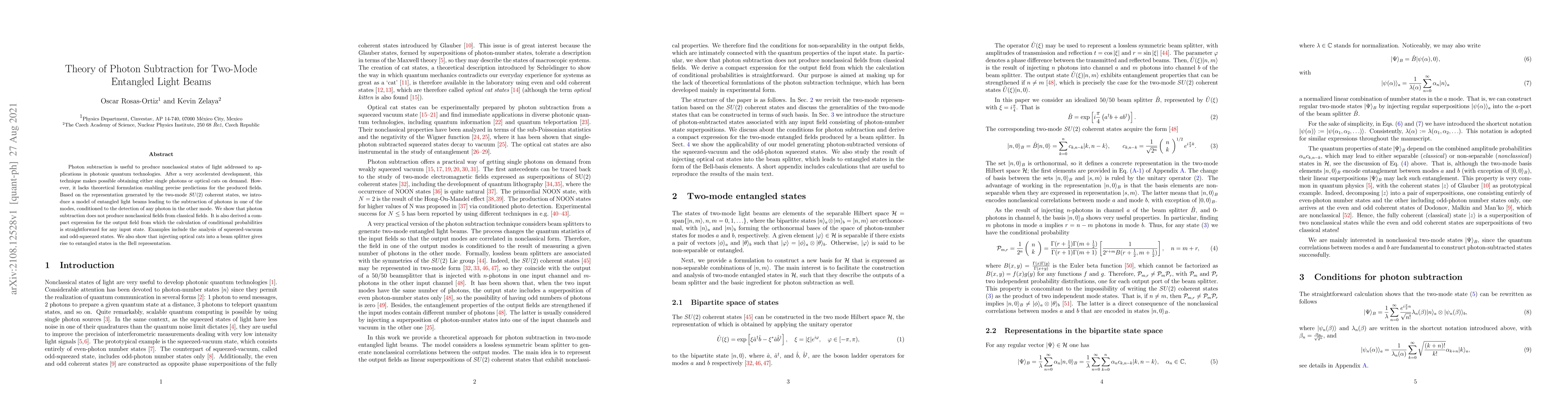 This paper develops a theoretical framework for photon subtraction in two-mode entangled light beams, providing a model for generating nonclassical states and deriving expressions for conditional probabilities. It demonstrates that photon subtraction does not produce nonclassical fields from classical ones, and explores applications like squeezed-vacuum and odd-squeezed states, as well as the entanglement of optical cats.