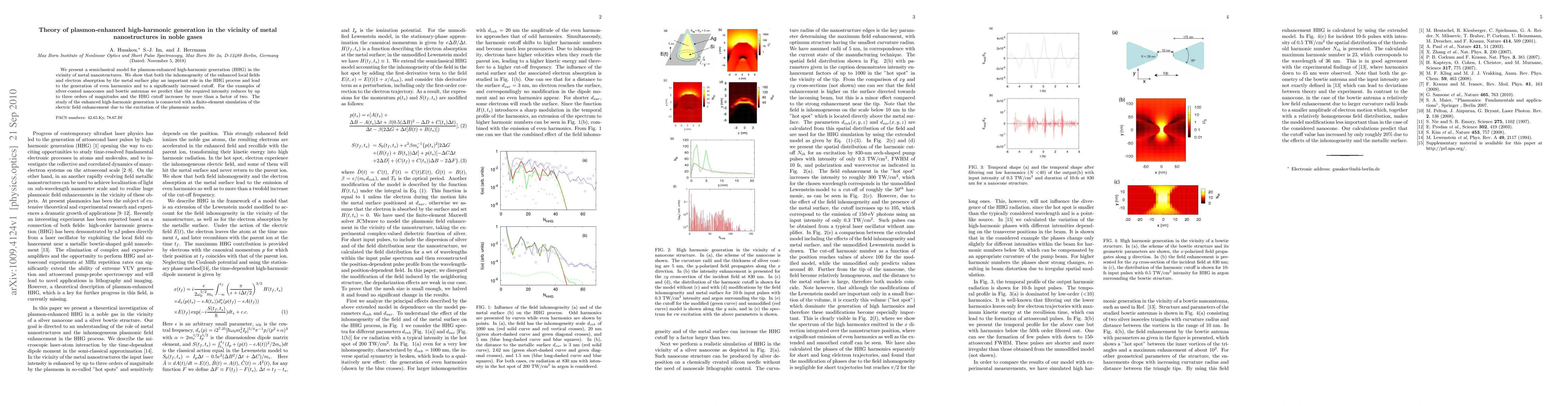 This paper proposes a semiclassical model explaining how plasmon-enhanced high-harmonic generation (HHG) near metal nanostructures significantly increases harmonic cutoffs and reduces required intensities, utilizing simulations to demonstrate the effect in silver-coated nanostructures.