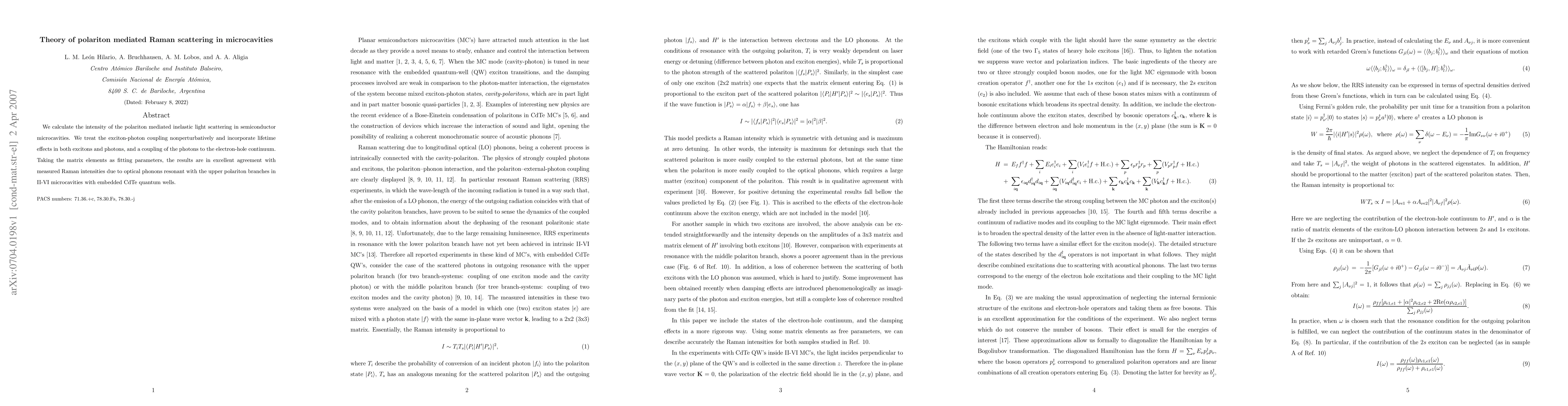 This paper calculates the intensity of polariton-mediated Raman scattering in semiconductor microcavities, treating exciton-photon coupling nonperturbatively and incorporating lifetime effects. The results match measured Raman intensities in II-VI microcavities with CdTe quantum wells, validating the theoretical model.