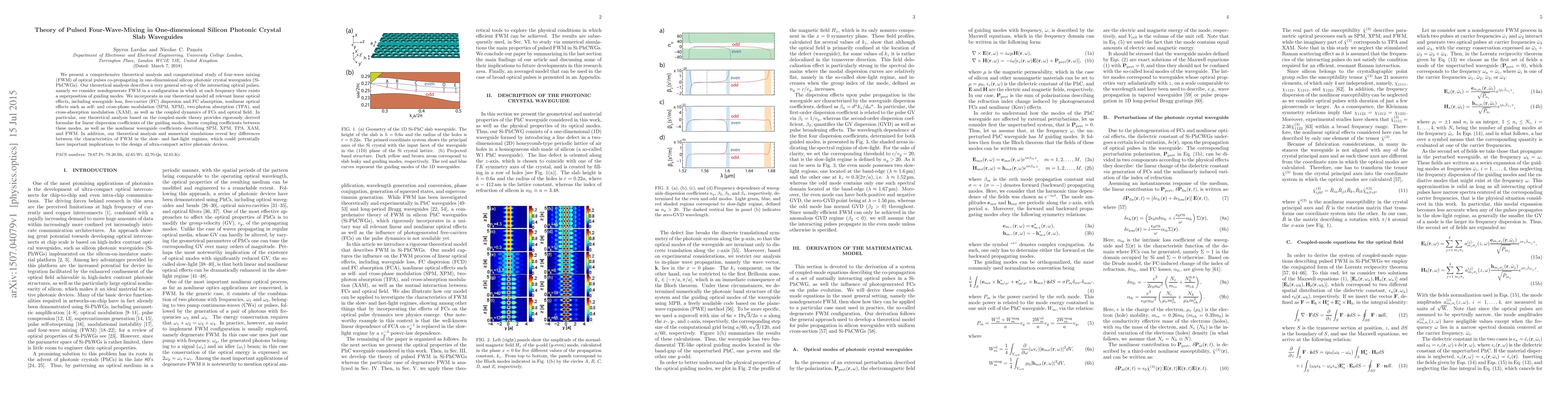 This paper presents a theoretical analysis and computational study of pulsed four-wave mixing (FWM) in one-dimensional silicon photonic crystal waveguides, incorporating various linear and nonlinear optical effects and comparing FWM characteristics in slow- and fast-light regimes for potential applications in ultra-compact photonic devices.