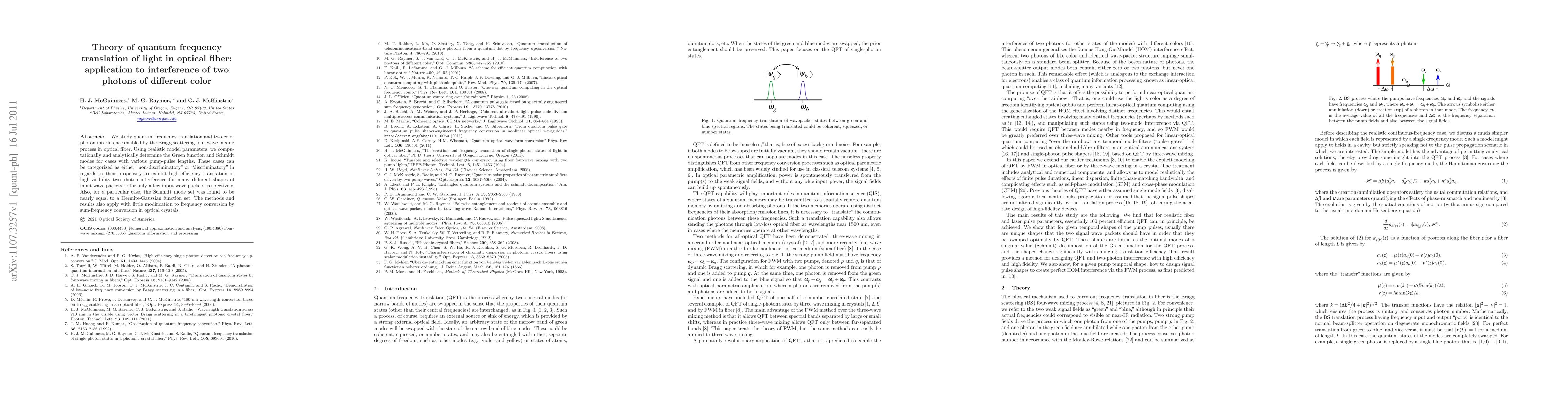 This research explores quantum frequency translation of light in optical fiber, enabling two-color photon interference via Bragg scattering four-wave mixing. It categorizes cases as 'non-discriminatory' or 'discriminatory' based on translation efficiency or interference visibility, with one case showing Schmidt modes near Hermite-Gaussian functions. The methods also apply to frequency conversion in optical crystals.