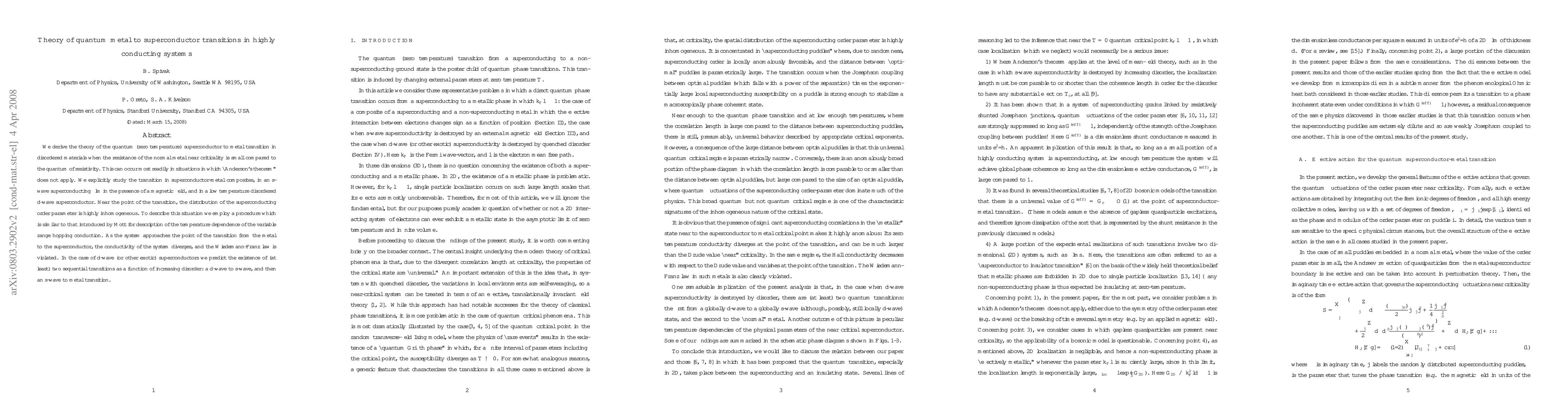 This research derives a theory for quantum transitions from metal to superconductor in disordered materials with small normal-state resistance. It explores superconductor-metal composites, s-wave films in magnetic fields, and disordered d-wave superconductors, finding highly inhomogeneous order parameter distributions near transition points. The study employs a Mott-like procedure for inhomogeneous conductivity and predicts Wiedemann-Franz law violation and sequential transitions (d-wave to s-wave, then s-wave to metal) in exotic superconductors under increasing disorder.