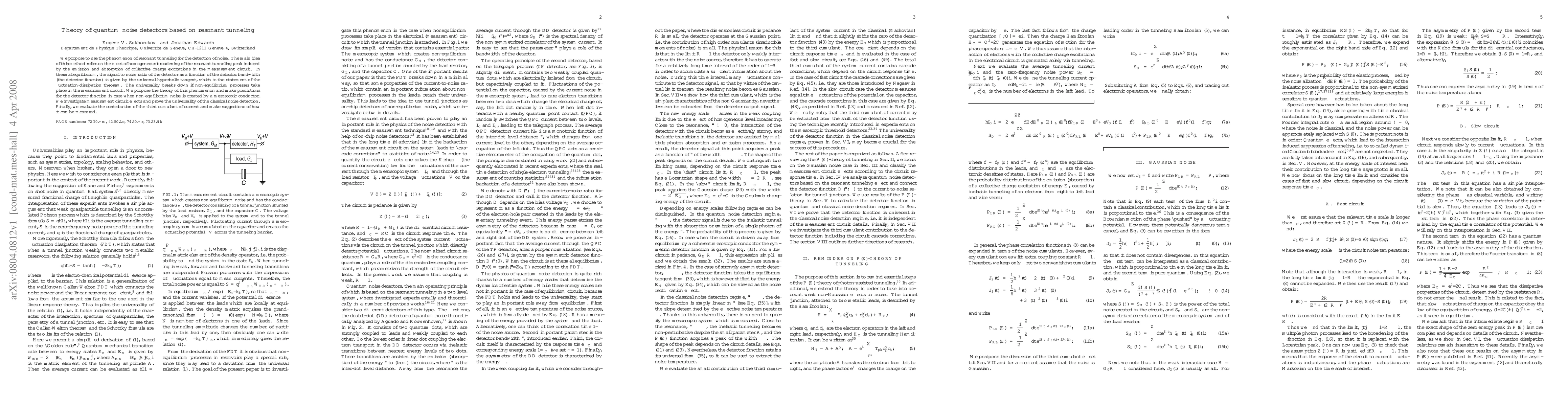 This paper proposes a quantum noise detector based on resonant tunneling, utilizing the homogeneous broadening of the tunneling peak due to collective charge excitations. It predicts the detector function's behavior under thermal equilibrium and non-equilibrium conditions, emphasizing the role of mesoscopic conductors and the third cumulant of current in noise detection.