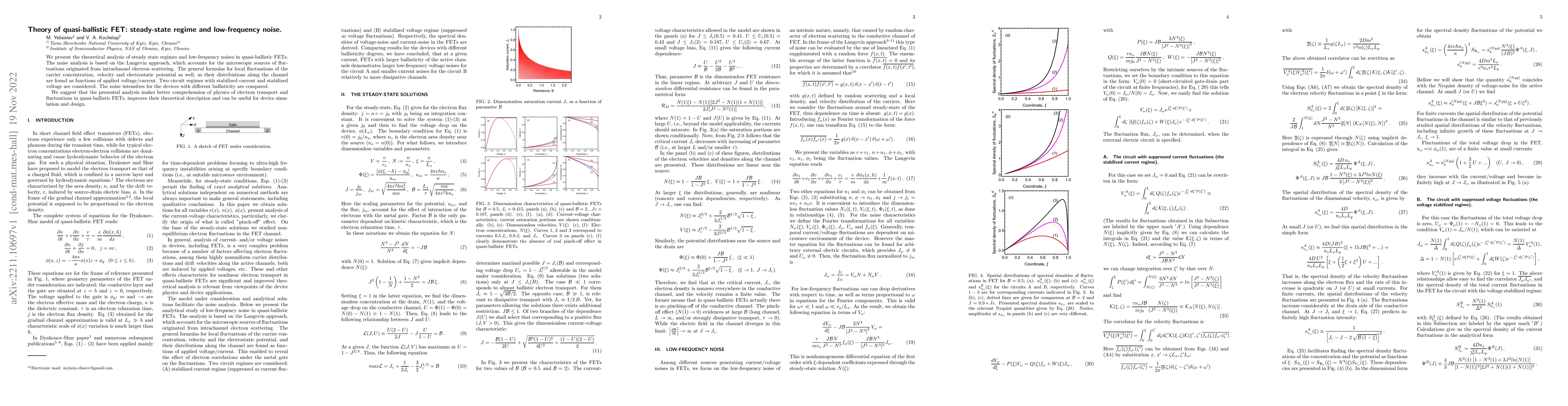 This paper theoretically analyzes steady-state regimes and low-frequency noise in quasi-ballistic FETs using the Langevin approach, revealing fluctuations from intrachannel electron scattering. The study compares noise intensities across different ballisticity levels and suggests enhanced understanding and improved theoretical descriptions for device simulation and design.