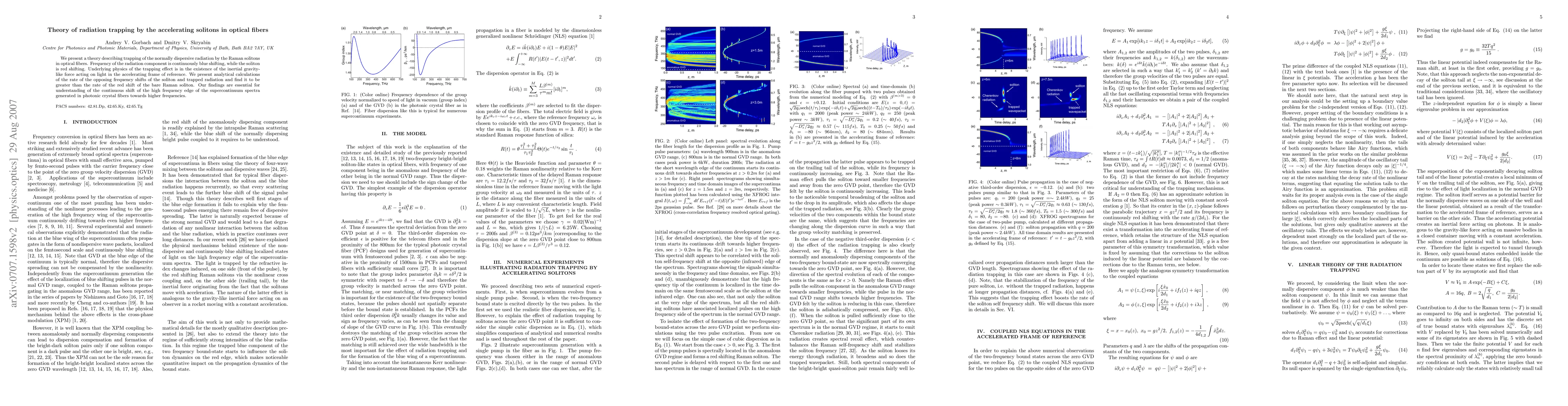This paper presents a theory explaining the trapping of normally dispersive radiation by Raman solitons in optical fibers, where the radiation blue shifts while the soliton red shifts. The trapping effect is attributed to an inertial force in the soliton's accelerating frame, and analytical calculations show the rate of opposing frequency shifts exceeds the soliton's red shift, crucial for understanding supercontinuum spectral shifts in photonic crystal fibers.