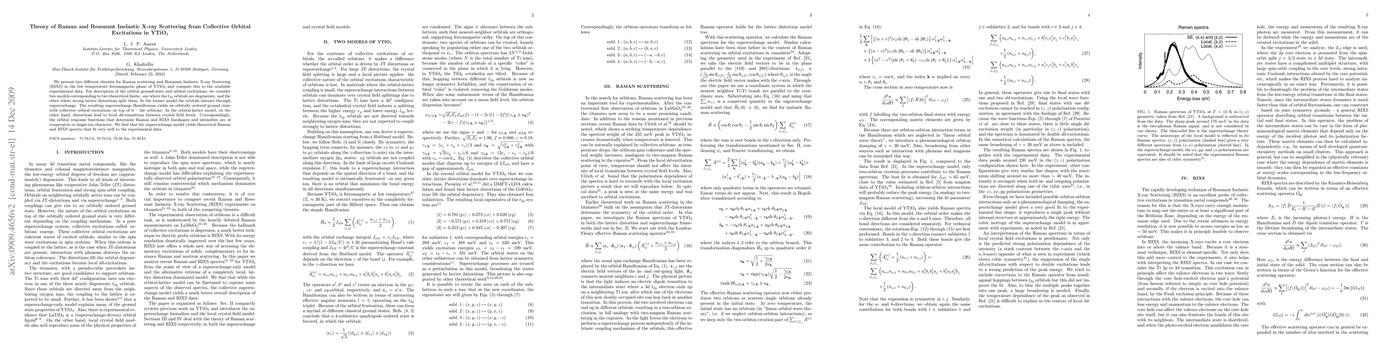 This paper develops two theoretical models for Raman and Resonant Inelastic X-ray Scattering in YTiO$_3$, finding that the superexchange model aligns closely with experimental data, particularly in describing collective orbital excitations known as orbitons.