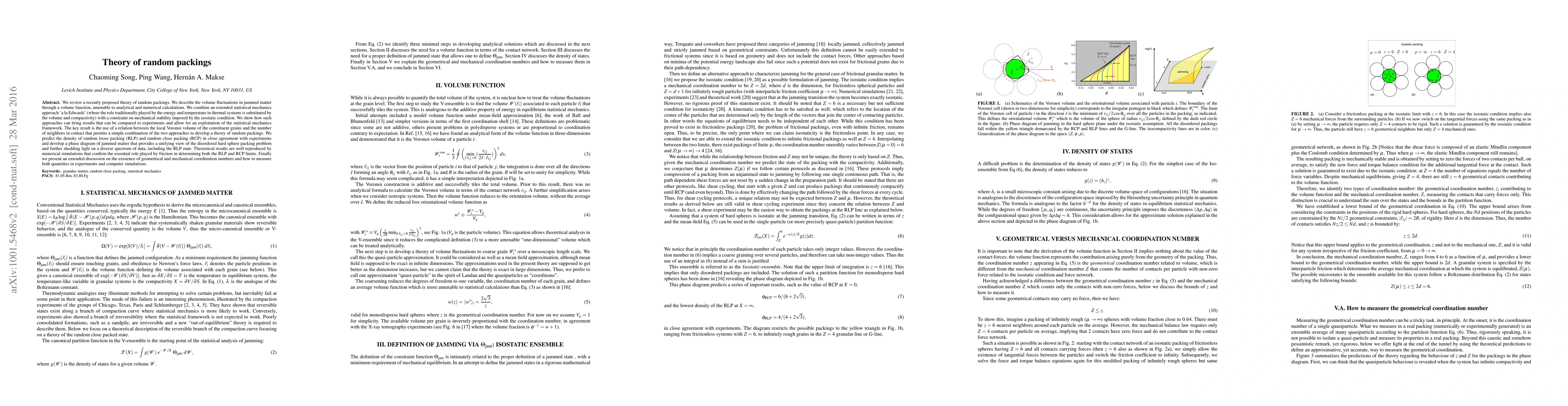 We review a recently proposed theory of random packings. We describe the volume fluctuations in jammed matter through a volume function, amenable to analytical and numerical calculations. We combine an extended statistical mechanics approach 'a la Edwards' (where the role traditionally played by the energy and temperature in thermal systems is substituted by the volume and compactivity) with a constraint on mechanical stability imposed by the isostatic condition. We show how such approaches can bring results that can be compared to experiments and allow for an exploitation of the statistical mechanics framework. The key result is the use of a relation between the local Voronoi volume of the constituent grains and the number of neighbors in contact that permits a simple combination of the two approaches to develop a theory of random packings. We predict the density of random loose packing (RLP) and random close packing (RCP) in close agreement with experiments and develop a phase diagram of jammed matter that provides a unifying view of the disordered hard sphere packing problem and further shedding light on a diverse spectrum of data, including the RLP state. Theoretical results are well reproduced by numerical simulations that confirm the essential role played by friction in determining both the RLP and RCP limits. Finally we present an extended discussion on the existence of geometrical and mechanical coordination numbers and how to measure both quantities in experiments and computer simulations.