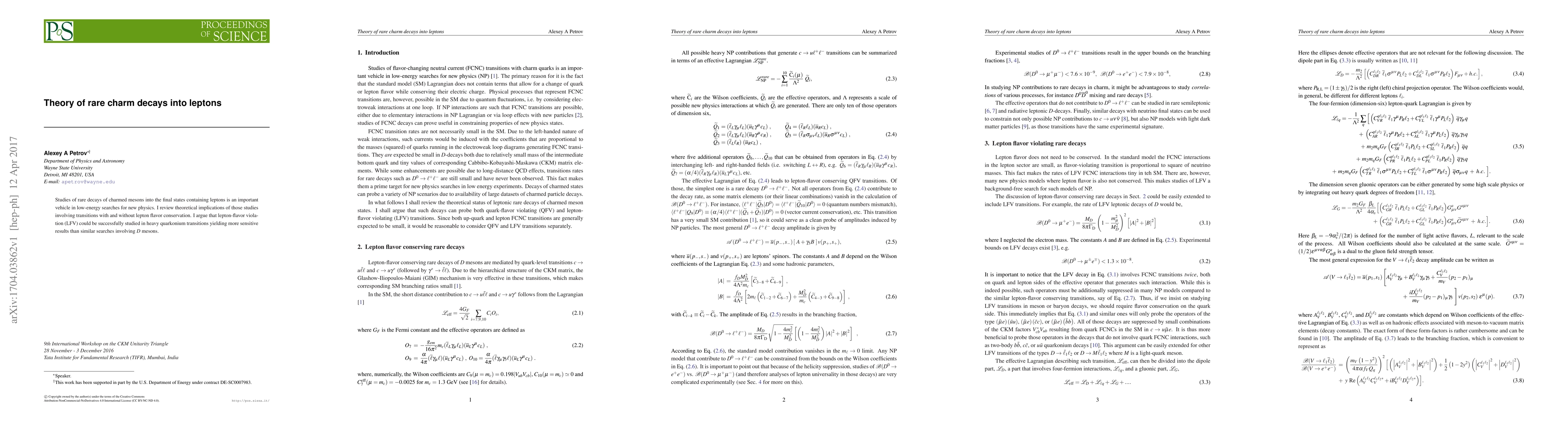 Studies of rare decays of charmed mesons into the final states containing leptons is an important vehicle in low-energy searches for new physics. I review theoretical implications of those studies involving transitions with and without lepton flavor conservation. I argue that lepton-flavor violation (LFV) could be successfully studied in heavy quarkonium transitions yielding more sensitive results than similar searches involving $D$ mesons.