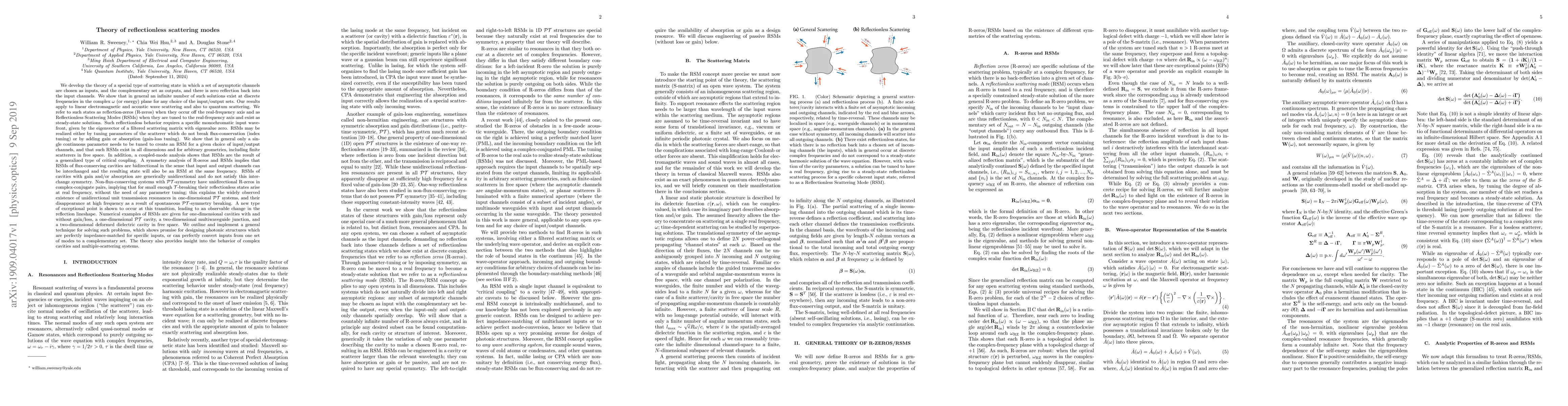 We develop the theory of a special type of scattering state in which a set of asymptotic channels are chosen as inputs and the complementary set as outputs, and there is zero reflection back into the input channels. In general an infinite number of such solutions exist at discrete complex frequencies. Our results apply to linear electromagnetic and acoustic wave scattering and also to quantum scattering, in all dimensions, for arbitrary geometries including scatterers in free space, and for any choice of the input/output sets. We refer to such a state as reflection-zero (R-zero) when it occurs off the real-frequency axis and as an Reflectionless Scattering Mode (RSM) when it is tuned to a real frequency as a steady-state solution. Such reflectionless behavior requires a specific monochromatic input wavefront, given by the eigenvector of a filtered scattering matrix with eigenvalue zero. Steady-state RSMs may be realized by index tuning which do not break flux conservation or by gain-loss tuning. RSMs of flux-conserving cavities are bidirectional while those of non-flux-conserving cavities are generically unidirectional. Cavities with ${\cal PT}$-symmetry have unidirectional R-zeros in complex-conjugate pairs, implying that reflectionless states naturally arise at real frequencies for small gain-loss parameter but move into the complex-frequency plane after a spontaneous ${\cal PT}$-breaking transition. Numerical examples of RSMs are given for one-dimensional cavities with and without gain/loss, a ${\cal PT}$ cavity, a two-dimensional multiwaveguide junction, and a two-dimensional deformed dielectric cavity in free space. We outline and implement a general technique for solving such problems, which shows promise for designing photonic structures which are perfectly impedance-matched for specific inputs, or can perfectly convert inputs from one set of modes to a complementary set.