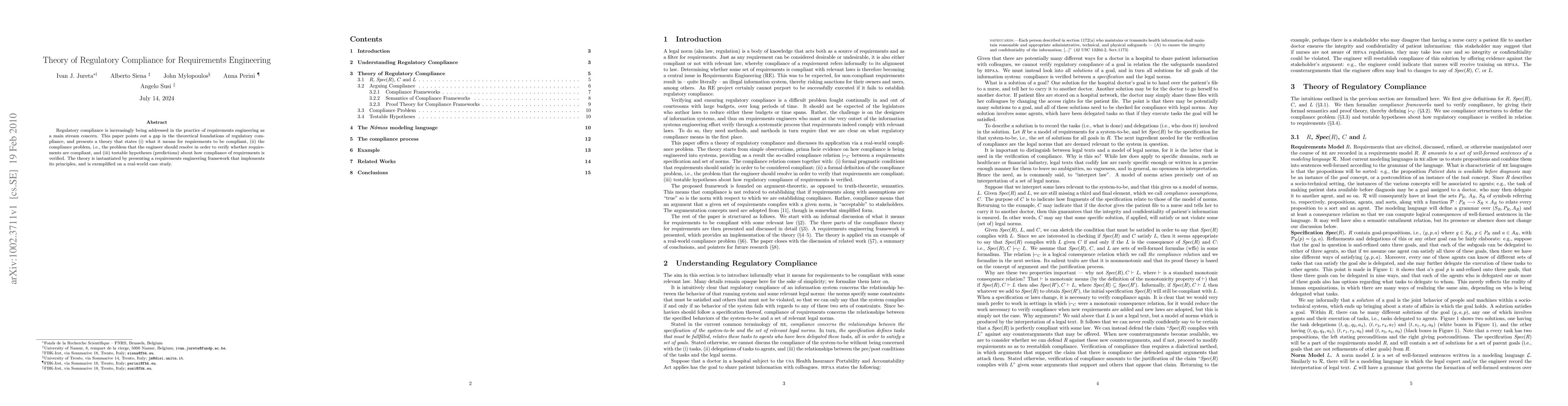 Regulatory compliance is increasingly being addressed in the practice of requirements engineering as a main stream concern. This paper points out a gap in the theoretical foundations of regulatory compliance, and presents a theory that states (i) what it means for requirements to be compliant, (ii) the compliance problem, i.e., the problem that the engineer should resolve in order to verify whether requirements are compliant, and (iii) testable hypotheses (predictions) about how compliance of requirements is verified. The theory is instantiated by presenting a requirements engineering framework that implements its principles, and is exemplified on a real-world case study.