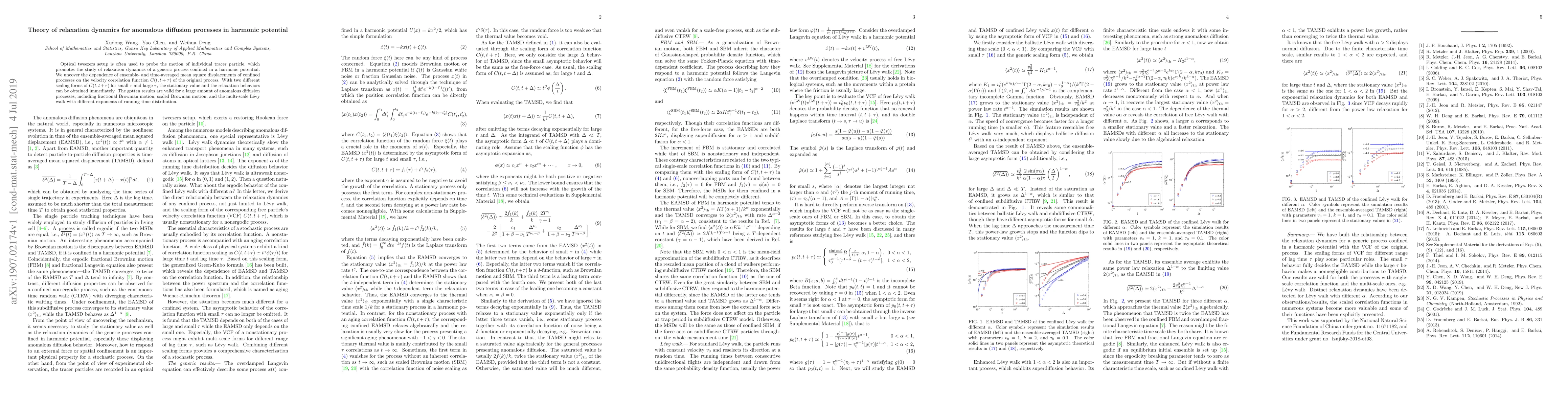 Optical tweezers setup is often used to probe the motion of individual tracer particle, which promotes the study of relaxation dynamics of a generic process confined in a harmonic potential. We uncover the dependence of ensemble- and time-averaged mean square displacements of confined processes on the velocity correlation function $C(t,t+\tau)$ of the original process. With two different scaling forms of $C(t,t+\tau)$ for small $\tau$ and large $\tau$, the stationary value and the relaxation behaviors can be obtained immediately. The gotten results are valid for a large amount of anomalous diffusion processes, including fractional Brownian motion, scaled Brownian motion, and the multi-scale L\'{e}vy walk with different exponents of running time distribution.