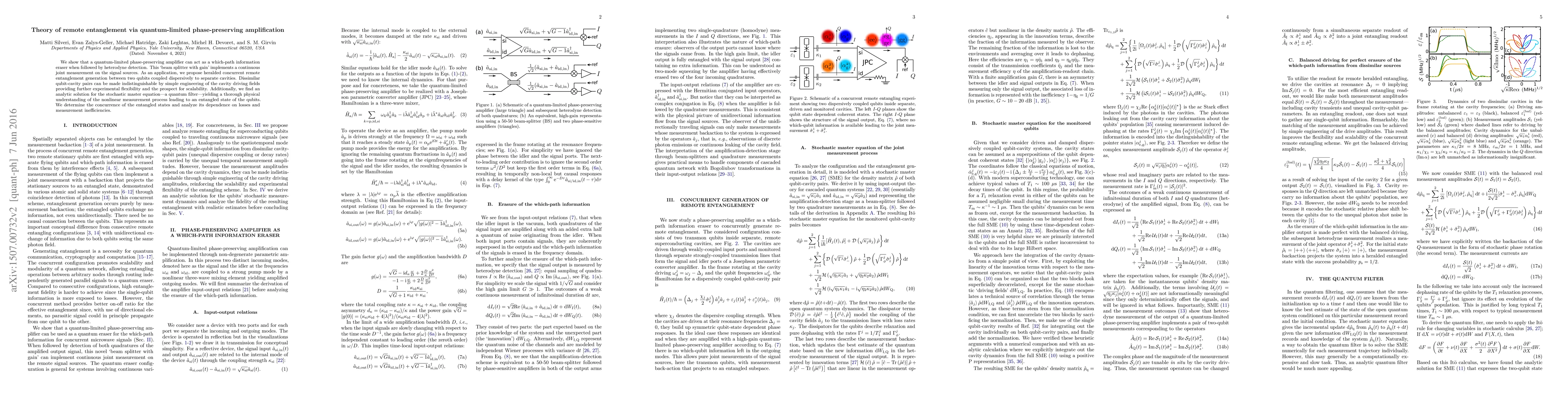 The paper presents a detailed theoretical framework for utilizing a quantum-limited phase-preserving amplifier followed by heterodyne detection for remote entanglement generation, including an analytic quantum filter solution.