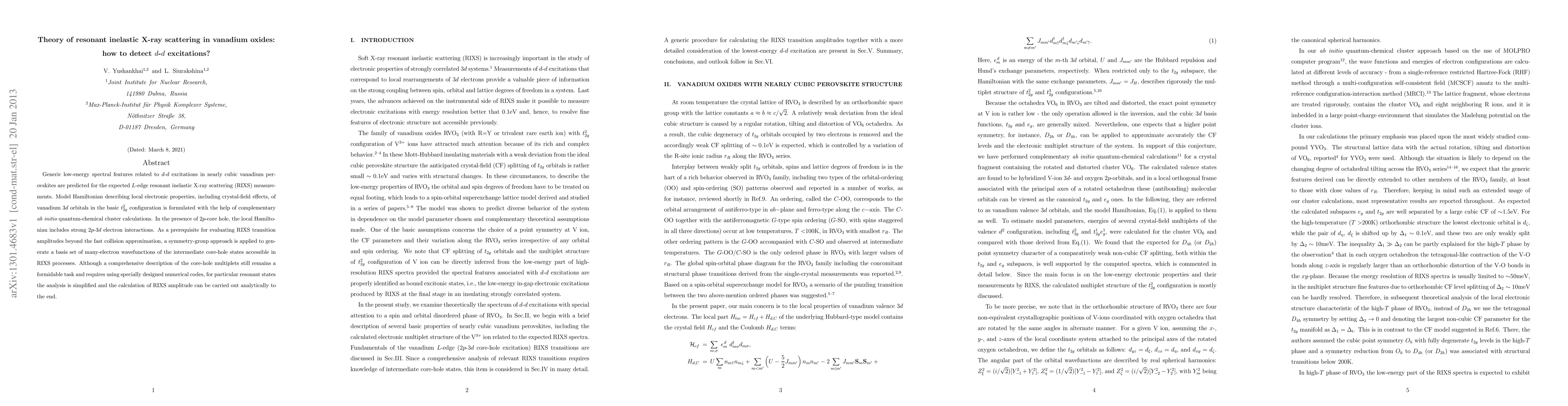 Generic low-energy spectral features related to $d$-$d$ excitations in nearly cubic vanadium perovskites are predicted for the expected $L$-edge resonant inelastic X-ray scattering (RIXS) measurements. Model Hamiltonian describing local electronic properties, including crystal-field effects, of vanadium 3d orbitals in the basic $t_{2g}^2$ configuration is formulated with the help of complementary {\it ab initio} quantum-chemical cluster calculations. In the presence of 2p-core hole, the local Hamiltonian includes strong 2p-3d electron interactions. As a prerequisite for evaluating RIXS transition amplitudes beyond the fast collision approximation, a symmetry-group approach is applied to generate a basis set of many-electron wavefunctions of the intermediate core-hole states accessible in RIXS processes. Although a comprehensive description of the core-hole multiplets still remains a formidable task and requires using specially designed numerical codes, for particular resonant states the analysis is simplified and the calculation of RIXS amplitude can be carried out analytically to the end.