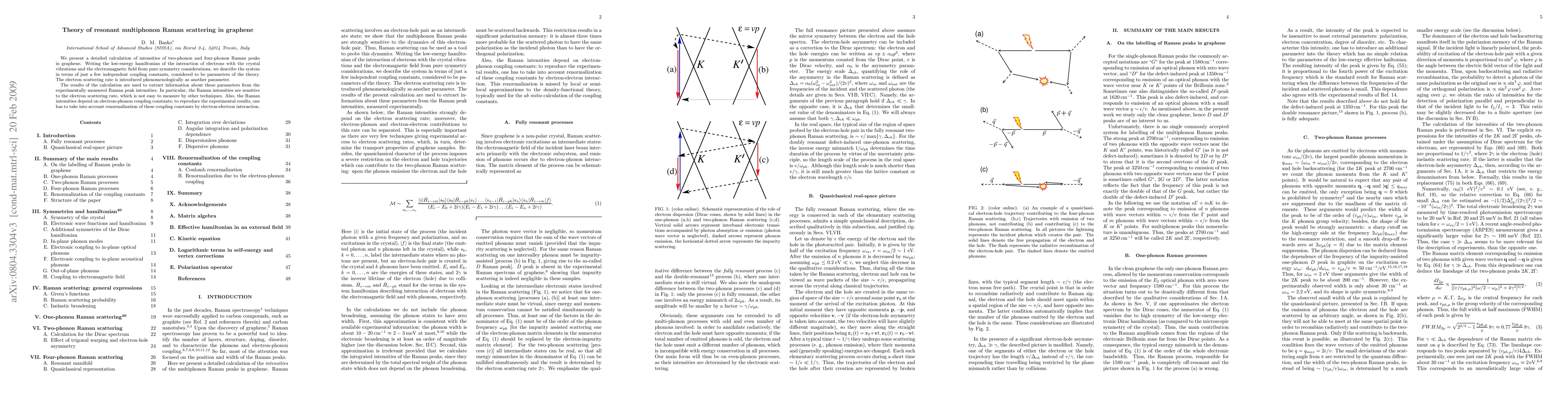 This paper calculates the intensities of two-phonon and four-phonon Raman peaks in graphene, deriving a low-energy Hamiltonian based on symmetry considerations and using experimental Raman data to extract values for the coupling constants and electron scattering rate.