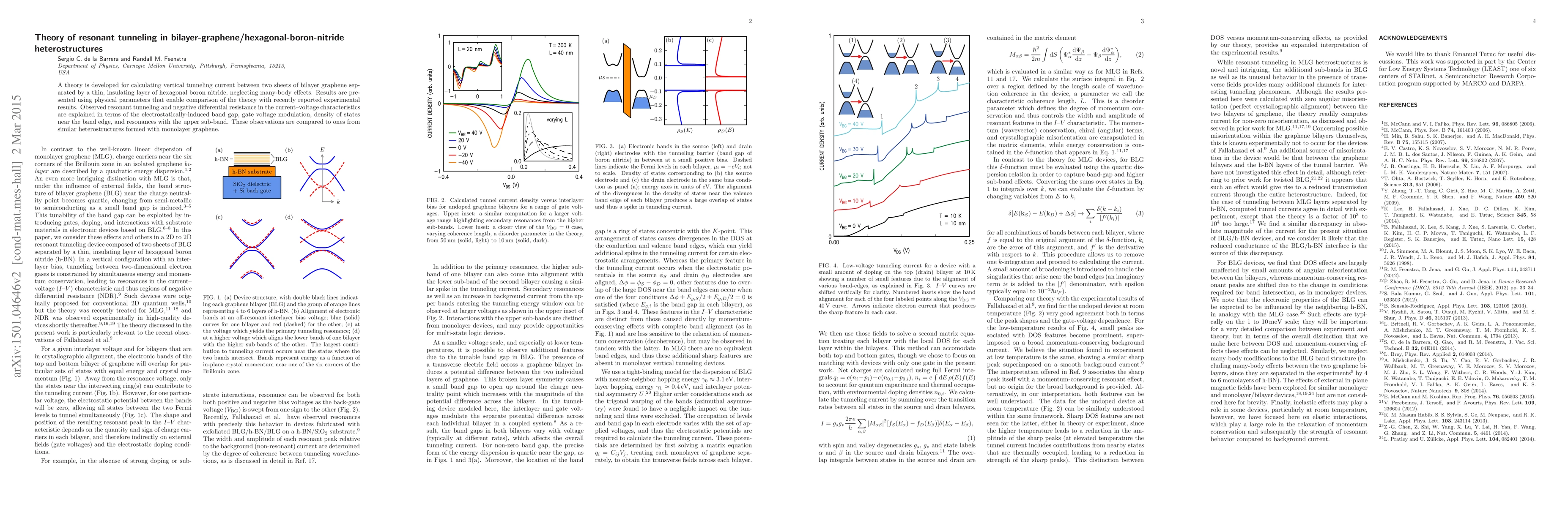 This paper develops a theory for calculating tunneling current in bilayer-graphene/hexagonal-boron-nitride heterostructures, explaining resonant tunneling and negative differential resistance through electrostatically-induced band gaps and density of states effects. Comparisons are made with monolayer graphene heterostructures.