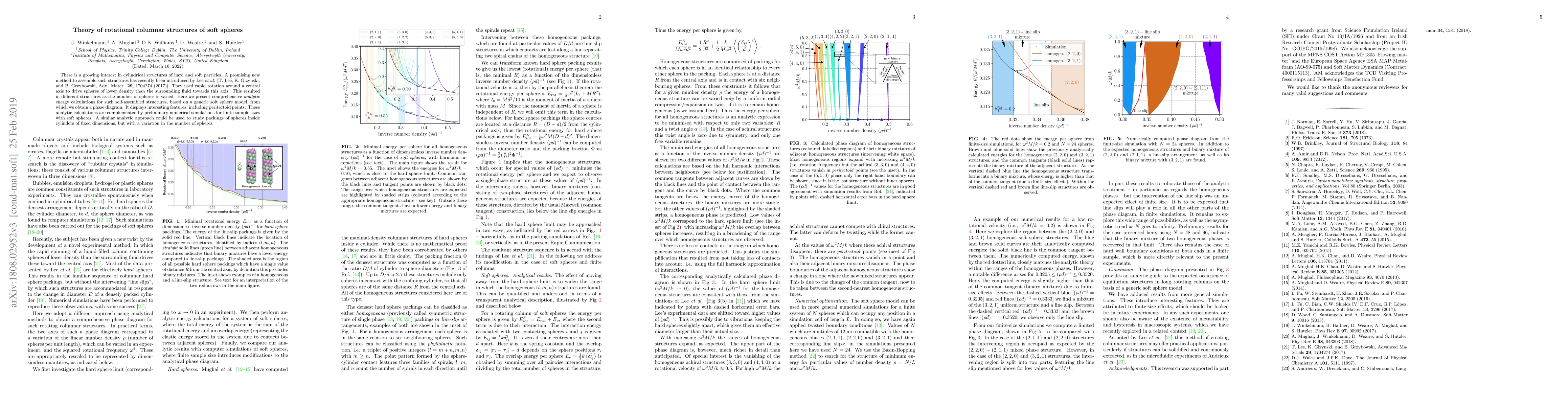 This paper presents analytic energy calculations and a phase diagram for rotational columnar structures of soft spheres assembled via rapid rotation, revealing peritectoid points. Preliminary numerical simulations support the findings, suggesting a broader applicability to sphere packings in cylindrical containers.