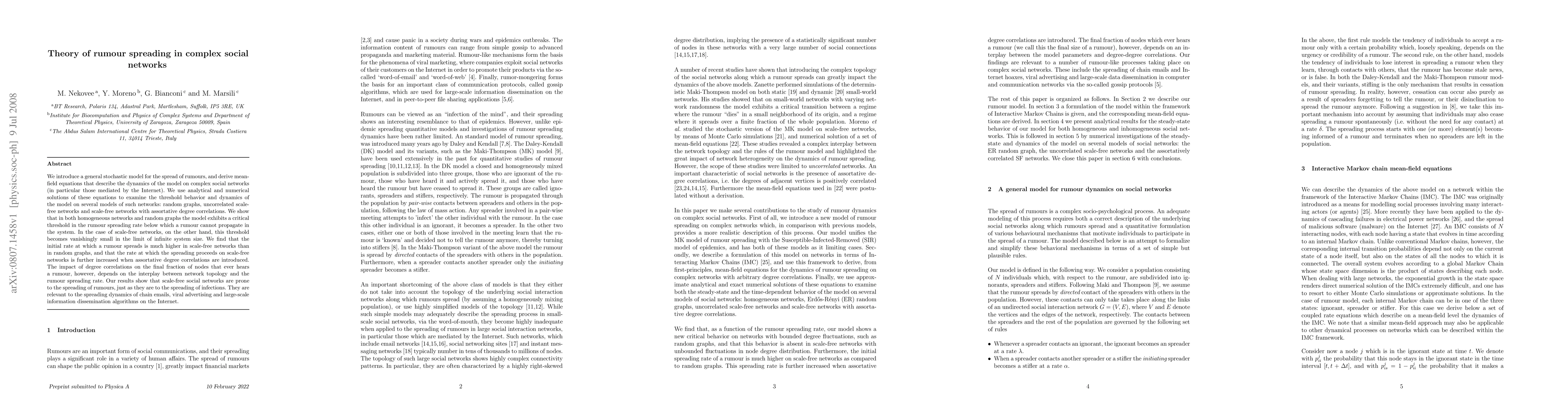 This paper develops a stochastic model for rumour spreading in complex social networks, finding that scale-free networks, especially those with assortative degree correlations, facilitate faster and more widespread rumour propagation compared to random graphs, highlighting the critical threshold dynamics in network rumour spread.