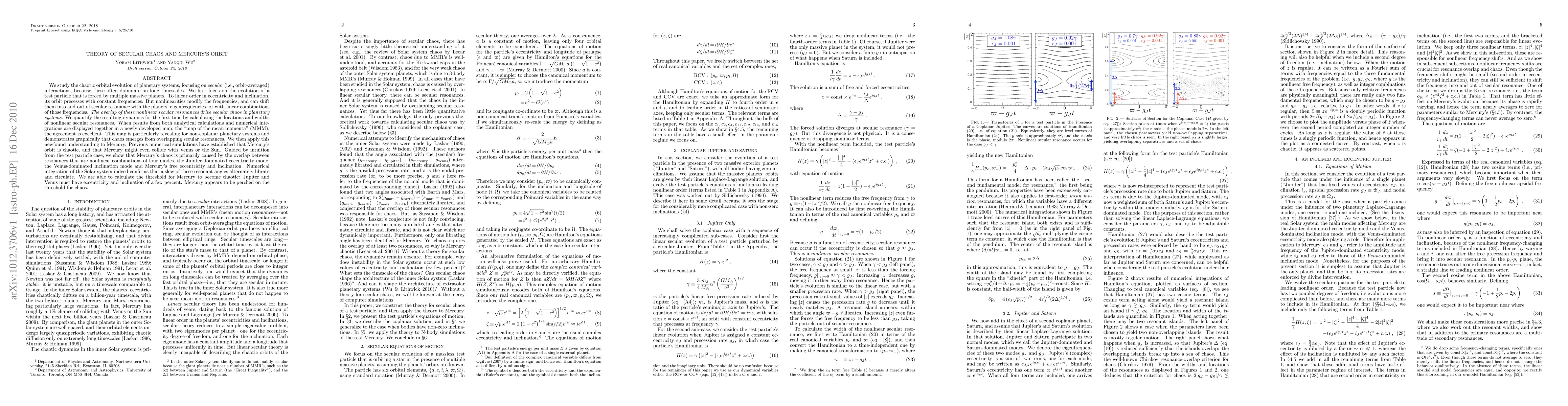 We study the chaotic orbital evolution of planetary systems, focusing on secular (i.e., orbit-averaged) interactions, because these often dominate on long timescales. We first focus on the evolution of a test particle that is forced by multiple massive planets. To linear order in eccentricity and inclination, its orbit precesses with constant frequencies. But nonlinearities can shift the frequencies into and out of secular resonance with the planets' eigenfrequencies, or with linear combinations of those frequencies. The overlap of these nonlinear secular resonances drive secular chaos in planetary systems. We quantify the resulting dynamics for the first time by calculating the locations and widths of nonlinear secular resonances. When results from both analytical calculations and numerical integrations are displayed together in a newly developed "map of the mean momenta" (MMM), the agreement is excellent. This map is particularly revealing for non-coplanar planetary systems and demonstrates graphically that chaos emerges from overlapping secular resonances. We then apply this newfound understanding to Mercury. Previous numerical simulations have established that Mercury's orbit is chaotic, and that Mercury might even collide with Venus or the Sun. We show that Mercury's chaos is primarily caused by the overlap between resonances that are combinations of four modes, the Jupiter-dominated eccentricity mode, the Venus-dominated inclination mode and Mercury's free eccentricity and inclination. Numerical integration of the Solar system confirms that a slew of these resonant angles alternately librate and circulate. We are able to calculate the threshold for Mercury to become chaotic: Jupiter and Venus must have eccentricity and inclination of a few percent. Mercury appears to be perched on the threshold for chaos.