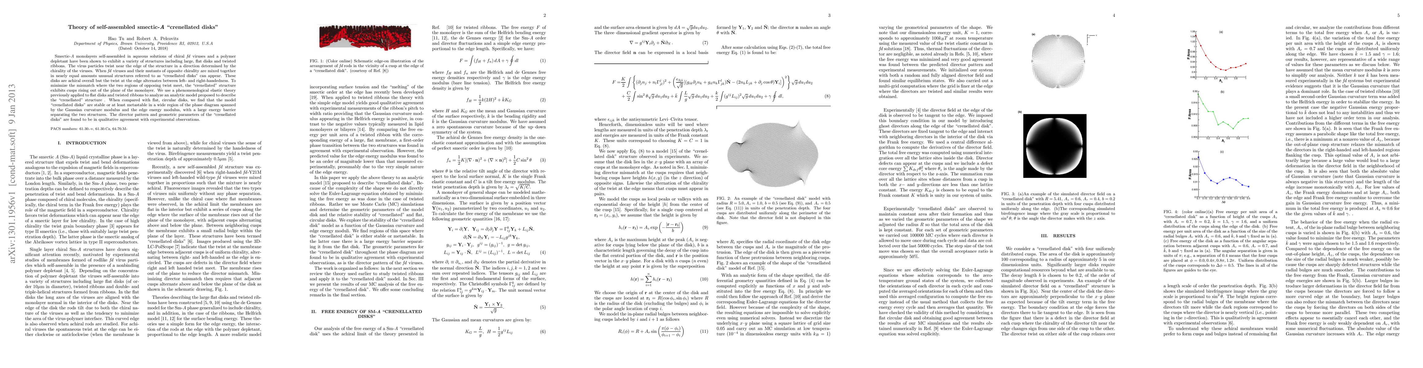 Smectic-A monolayers self-assembled in aqueous solutions of chiral fd viruses and a polymer depletant have been shown to exhibit a variety of structures including large, flat disks and twisted ribbons. The virus particles twist near the edge of the structure in a direction determined by the chirality of the viruses. When fd viruses and their mutants of opposite chirality are mixed together in nearly equal amounts unusual structures referred to as "crenellated disks" can appear. These disks are achiral overall but the twist at the edge alternates between left- and right-handedness. To minimize the mismatch where the two regions of opposing twist meet, the "crenellated" structure exhibits cusps rising out of the plane of the monolayer. We use a phenomenological elastic theory previously applied to flat disks and twisted ribbons to analyze an analytic model proposed to describe the "crenellated" structure . When compared with flat, circular disks, we find that the model "crenellated disks" are stable or at least metastable in a wide region of the phase diagram spanned by the Gaussian curvature modulus and the edge energy modulus, with a large energy barrier separating the two structures. The director pattern and geometric parameters of the "crenellated disks" are found to be in qualitative agreement with experimental observations.