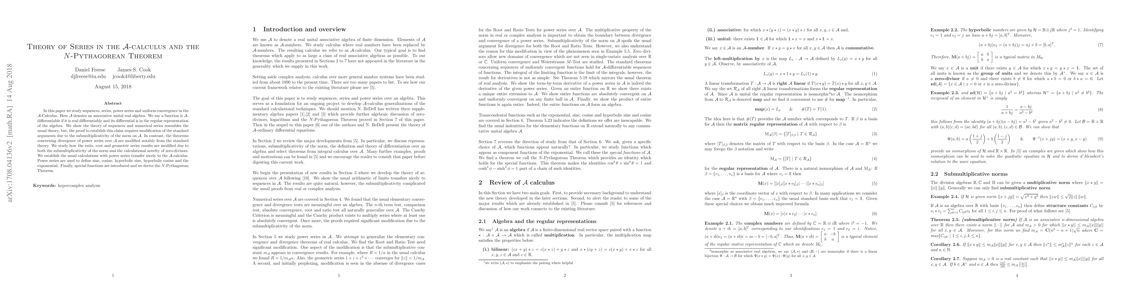 This paper develops the $\mathcal{A}$-calculus theory for sequences, series, and power series within an associative unital real algebra, emphasizing modifications needed due to norm submultiplicativity and zero-divisors. It derives standard real analysis identities for uniformly convergent series and introduces special functions, culminating in the $N$-Pythagorean Theorem.