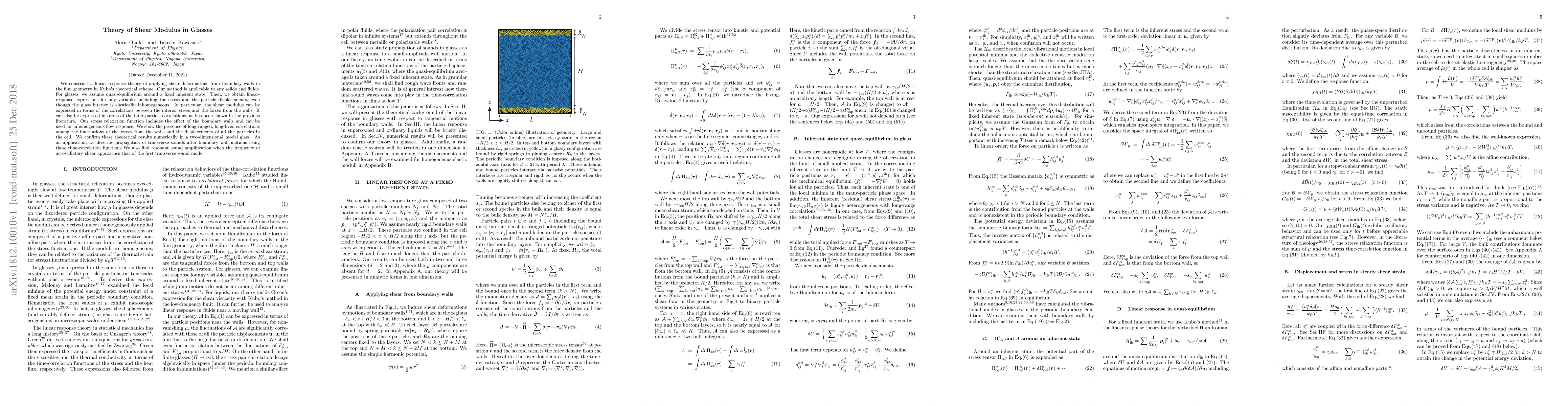 We construct a linear response theory of applying shear deformations from boundary walls in the film geometry in Kubo's theoretical scheme. Our method is applicable to any solids and fluids. For glasses, we assume quasi-equilibrium around a fixed inherent state. Then, we obtain linear-response expressions for any variables including the stress and the particle displacements, even though the glass interior is elastically inhomogeneous. In particular, the shear modulus can be expressed in terms of the correlations between the interior stress and the forces from the walls. It can also be expressed in terms of the inter-particle correlations, as has been shown in the previous literature. Our stress relaxation function includes the effect of the boundary walls and can be used for inhomogeneous flow response. We show the presence of long-ranged, long-lived correlations among the fluctuations of the forces from the walls and the displacements of all the particles in the cell. We confirm these theoretical results numerically in a two-dimensional model glass. As an application, we describe propagation of transverse sounds after boundary wall motions using these time-correlation functions We also find resonant sound amplification when the frequency of an oscillatory shear approaches that of the first transverse sound mode.