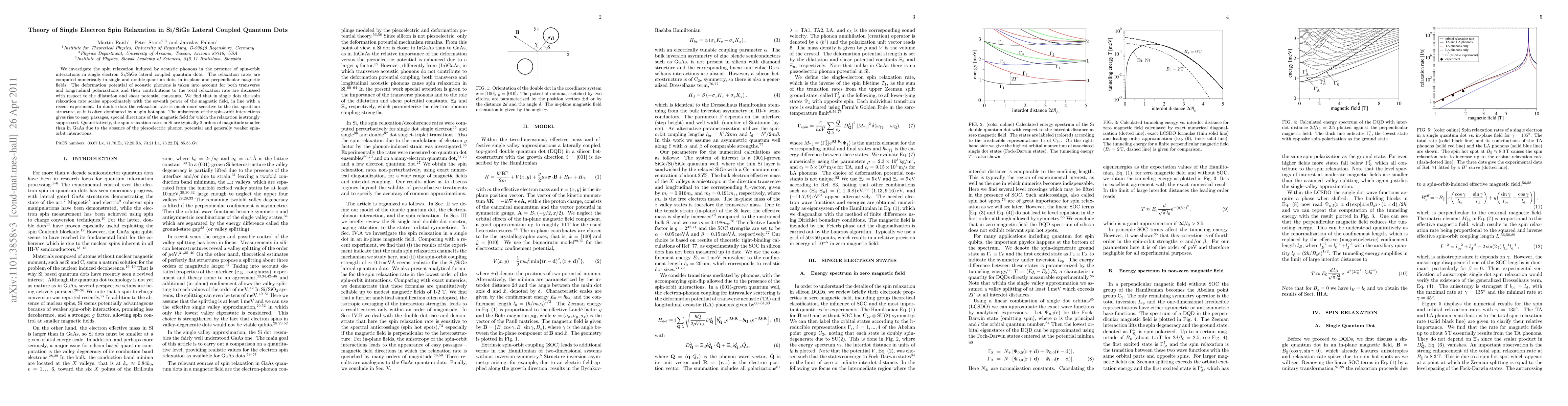 This paper numerically investigates spin relaxation in single and double Si/SiGe lateral coupled quantum dots, focusing on acoustic phonon-induced relaxation under spin-orbit interactions. The study finds that single dot relaxation scales with the seventh power of the magnetic field, while double dot relaxation is highly sensitive to the dot spectrum and magnetic field direction due to anisotropy effects.