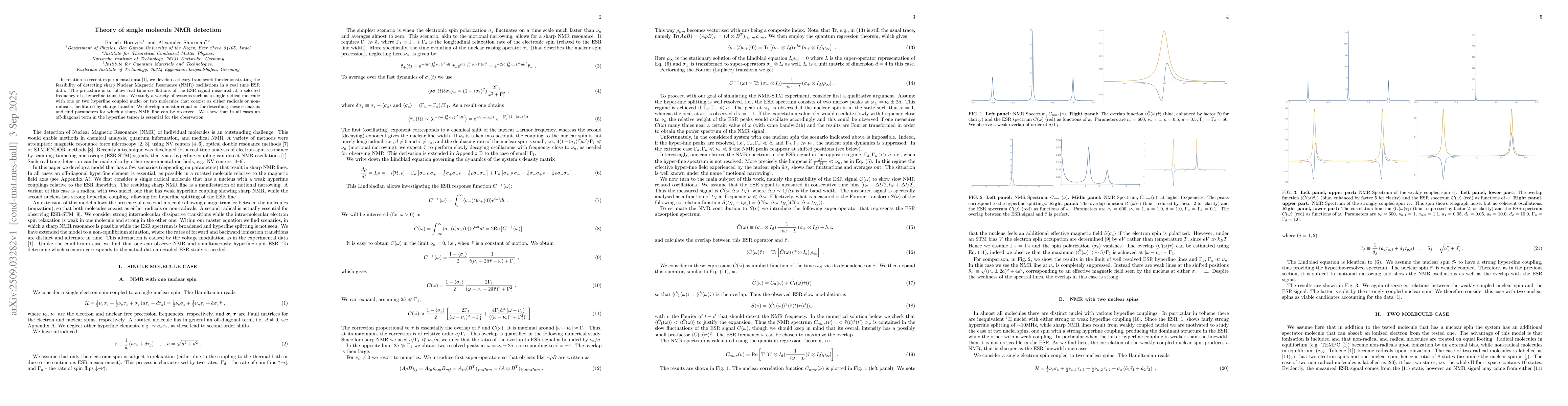In relation to recent experimental data [1], we develop a theory framework for demonstrating the feasibility of detecting sharp Nuclear Magnetic Resonance (NMR) oscillations in a real time ESR data. The procedure is to follow real time oscillations of the ESR signal measured at a selected frequency of a hyperfine transition. We study a variety of systems such as a single radical molecule with one or two hyperfine coupled nuclei or two molecules that coexist as either radicals or non-radicals, facilitated by charge transfer. We develop a master equation for describing these scenarios and find parameters for which a sharp NMR line can be observed. We show that in all cases an off-diagonal term in the hyperfine tensor is essential for the observation.