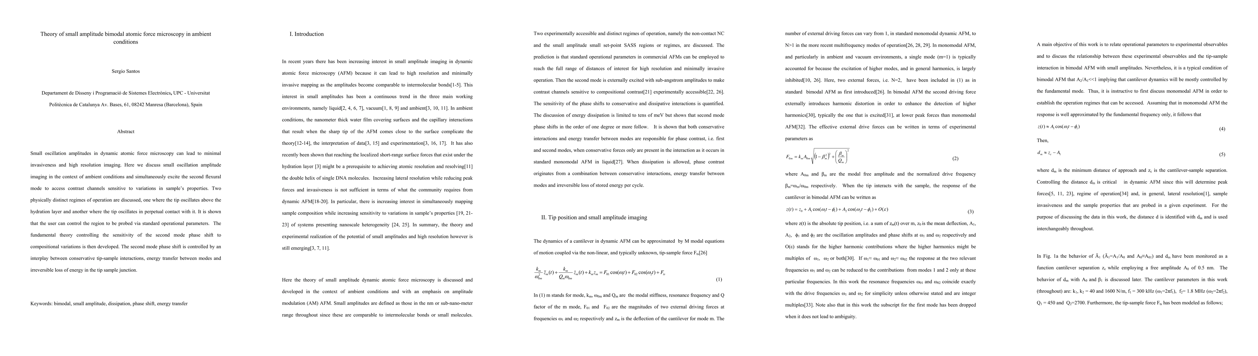 This paper develops a theoretical framework for small amplitude bimodal atomic force microscopy under ambient conditions, focusing on high-resolution imaging by exciting the second flexural mode. It explores two operational regimes, discussing how the phase shift sensitivity of the second mode relates to compositional variations through tip-sample interactions and energy transfer.