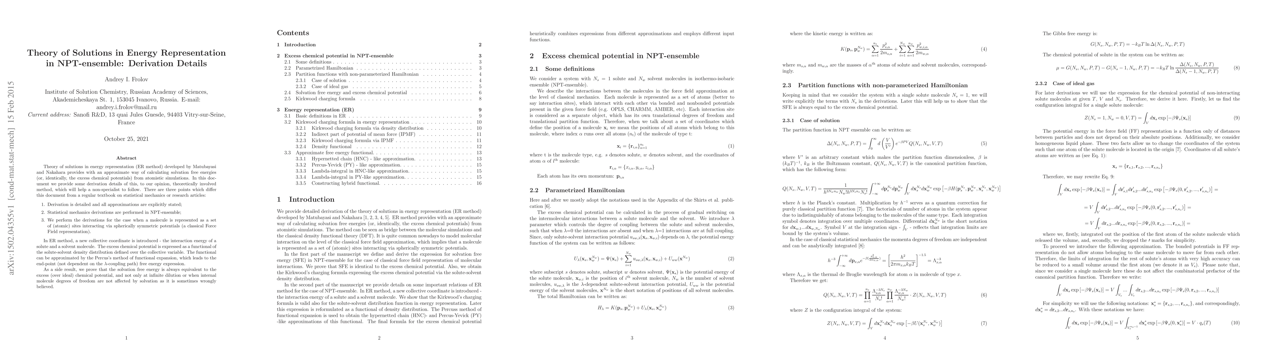 Theory of solutions in energy representation (ER method) developed by Matubayasi and Nakahara provides with an approximate way of calculating solvation free energies (or, identically, the excess chemical potentials) from atomistic simulations. In this document we provide some derivation details of this, to our opinion, theoretically involved method, which will help a non-specialist to follow. There are three points which differ this document from a regular textbook on statistical mechanics or research articles: 1) Derivation is detailed and all approximations are explicitly stated; 2) Statistical mechanics derivations are performed in NPT-ensemble; 3) We perform the derivations for the case when a molecule is represented as a set of (atomic) sites interacting via spherically symmetric potentials (a classical Force Field representation). In ER method, a new collective coordinate is introduced - the interaction energy of a solute and a solvent molecule. The excess chemical potential is expressed as a functional of the solute-solvent density distribution defined over the collective variable. The functional can be approximated by the Percus's method of functional expansion, which leads to the end-point (not dependent on the $\lambda$-coupling path) free energy expression. As a side result, we prove that the solvation free energy is always equivalent to the excess (over ideal) chemical potential, and not only at infinite dilution or when internal molecule degrees of freedom are not affected by solvation as it is sometimes wrongly believed.