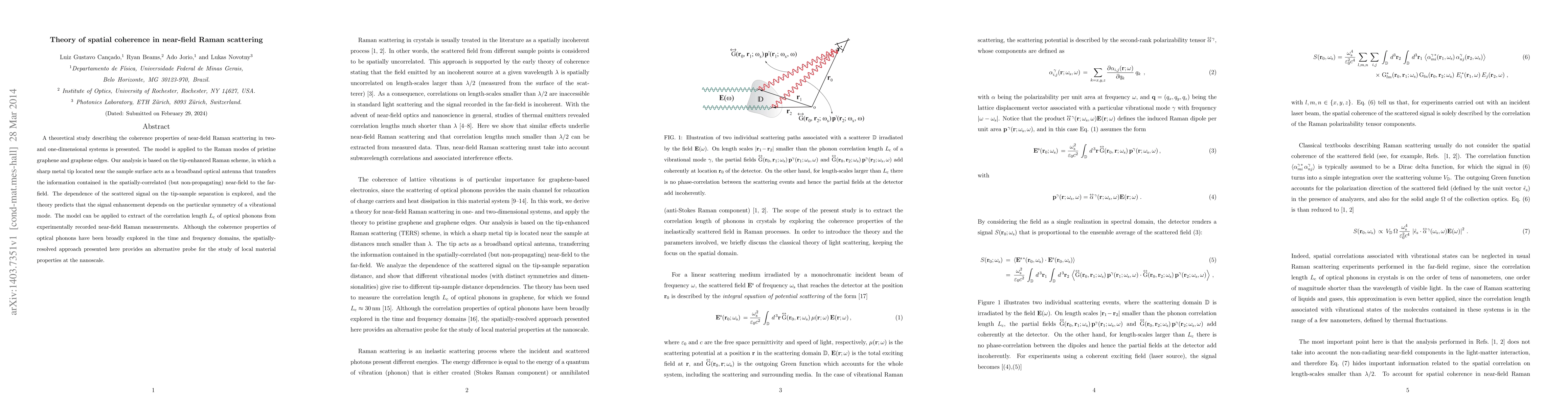 A theoretical study describing the coherence properties of near-field Raman scattering in two- and one-dimensional systems is presented. The model is applied to the Raman modes of pristine graphene and graphene edges. Our analysis is based on the tip-enhanced Raman scheme, in which a sharp metal tip located near the sample surface acts as a broadband optical antenna that transfers the information contained in the spatially-correlated (but non-propagating) near-field to the far-field. The dependence of the scattered signal on the tip-sample separation is explored, and the theory predicts that the signal enhancement depends on the particular symmetry of a vibrational mode. The model can be applied to extract of the correlation length $L_{\rm c}$ of optical phonons from experimentally recorded near-field Raman measurements. Although the coherence properties of optical phonons have been broadly explored in the time and frequency domains, the spatially-resolved approach presented here provides an alternative probe for the study of local material properties at the nanoscale.